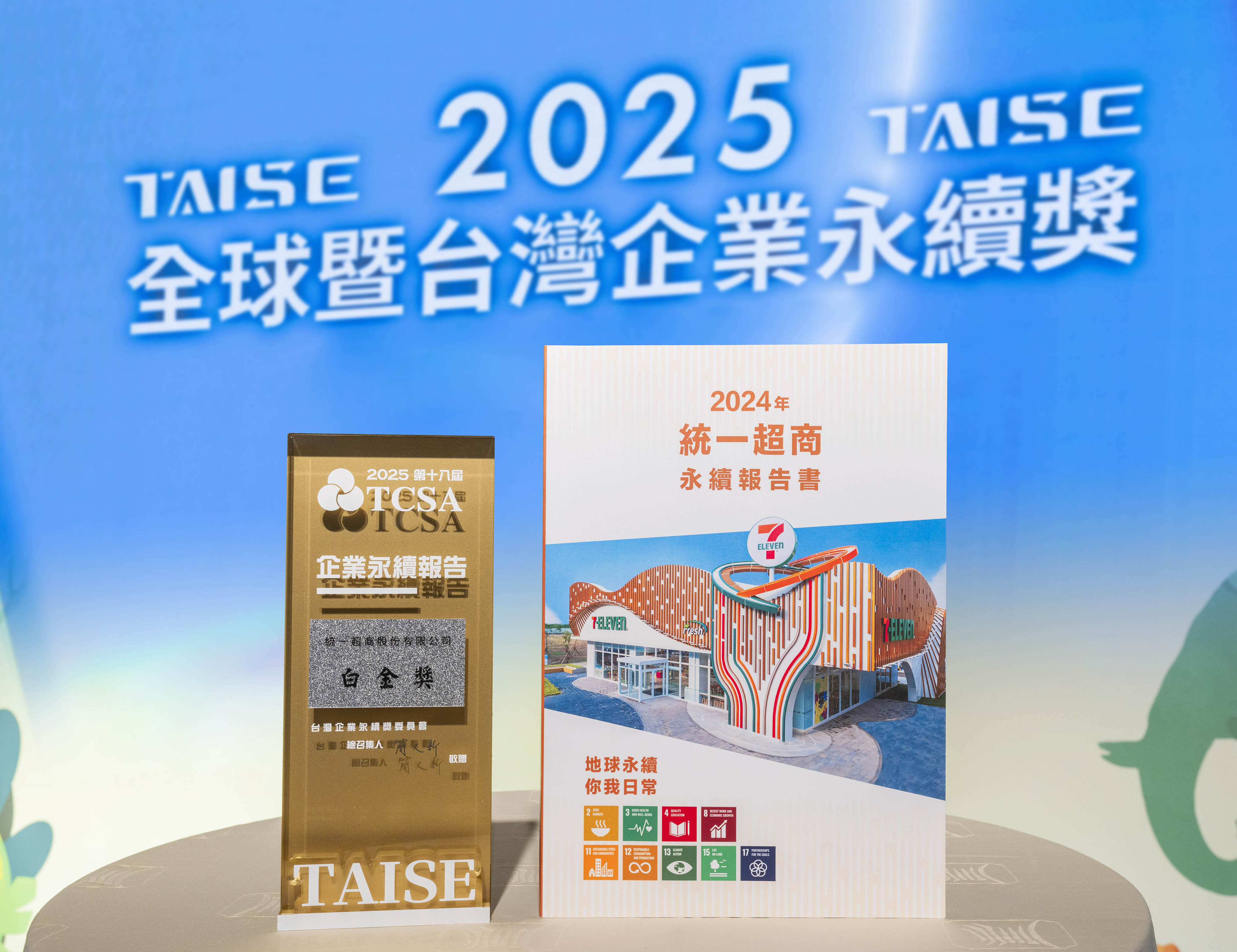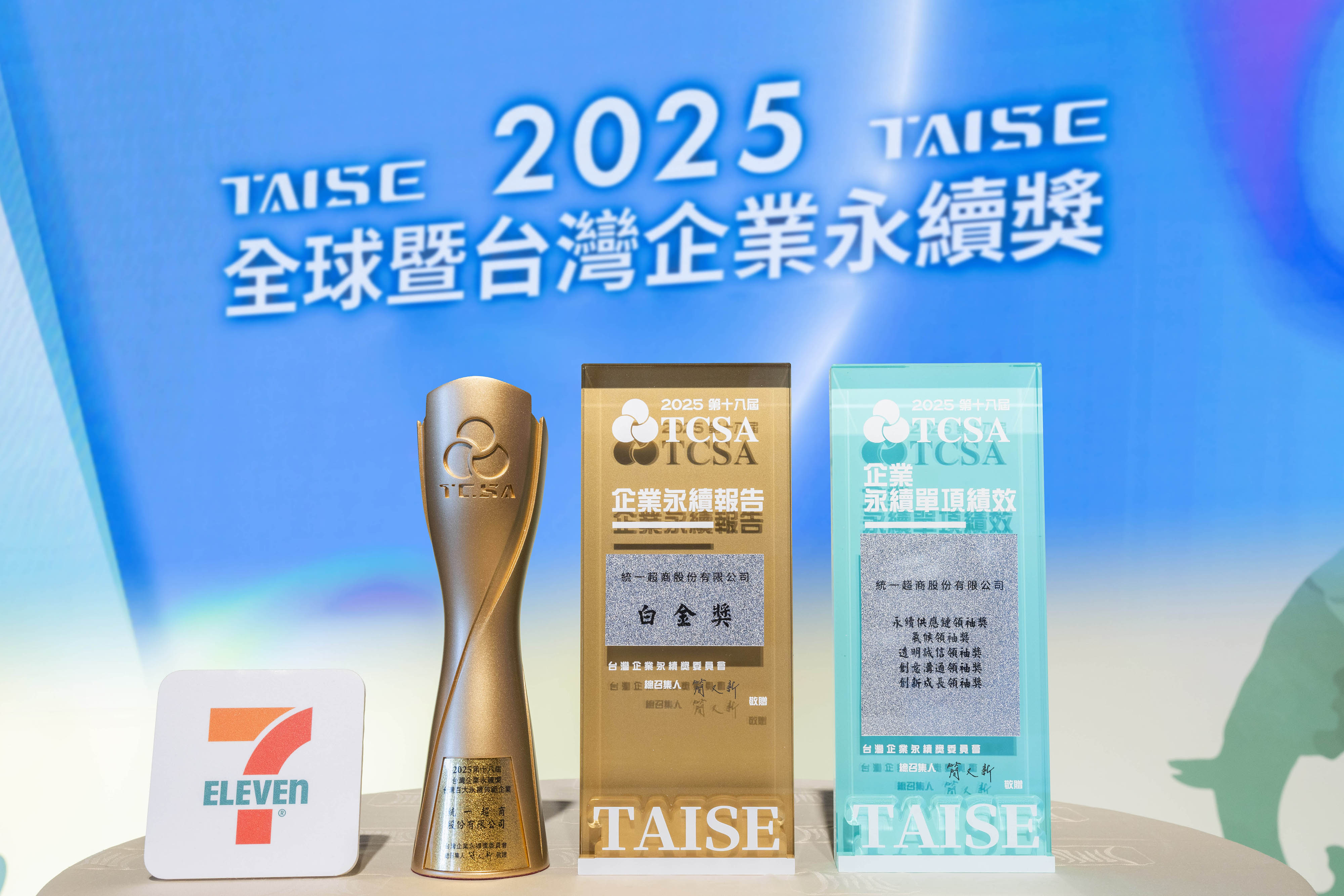 由台灣永續能源研究基金會(TAISE)主辦「2025台灣企業永續獎(TCSA)」頒獎典禮今(11/26)登場,統一超商九度入選、共榮獲7項大獎,一舉囊括「企業永續報告類貿易百貨業-白金獎」、「綜合績效獎-台灣百大永續企業獎」及「永續供應鏈領袖獎」「創新成長領袖獎」「創意溝通領袖獎」、「氣候領袖獎」、「透明誠信領袖獎」等5項永續單項績效獎,今年為第5次榮獲貿易百貨業白金獎,在永續報告類及綜合績效獎皆為取得該業別第一名佳績,亦是零售業獲獎最多的公司之一,展現統一超商在長期實踐SDGs及落實永續發展的成果。