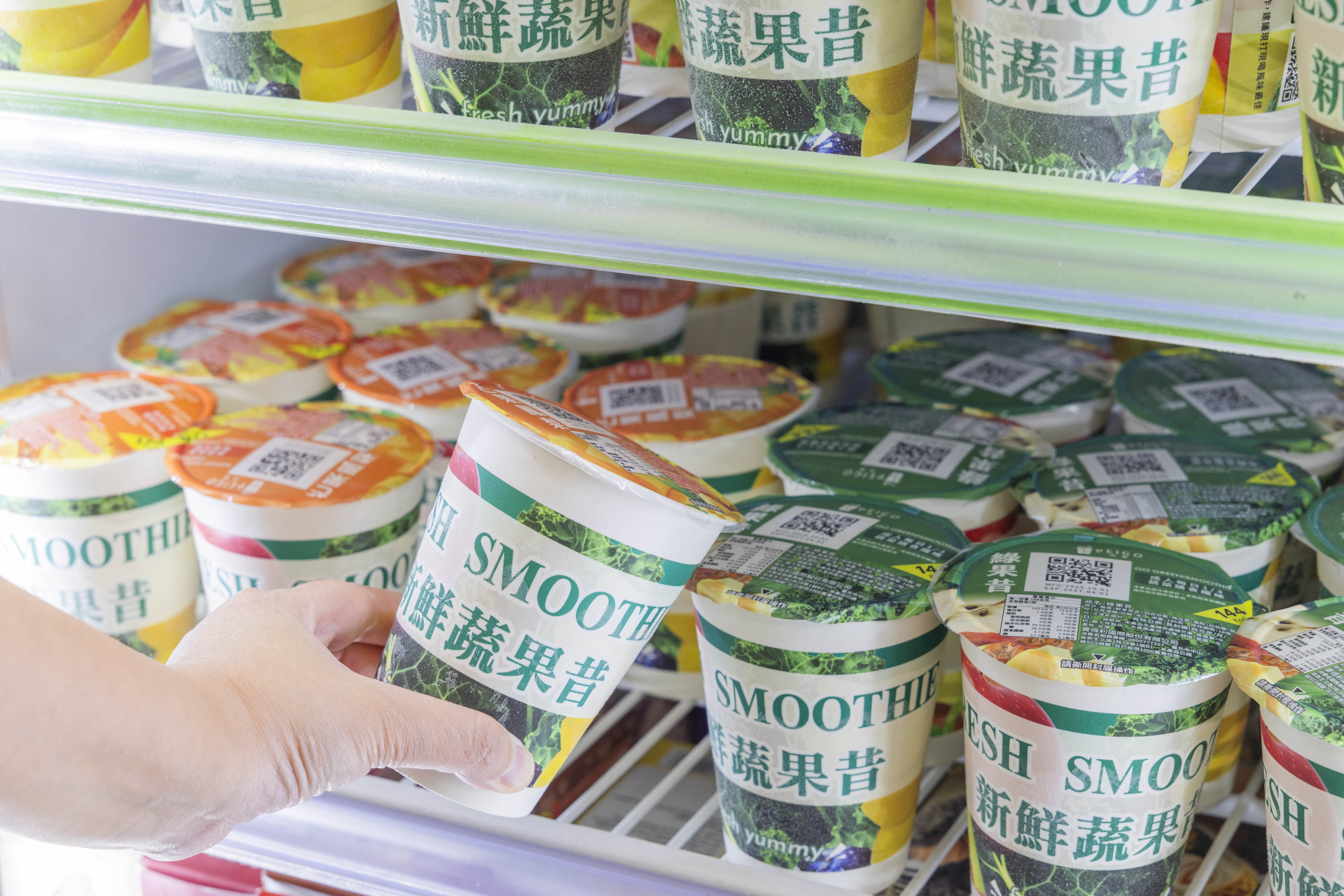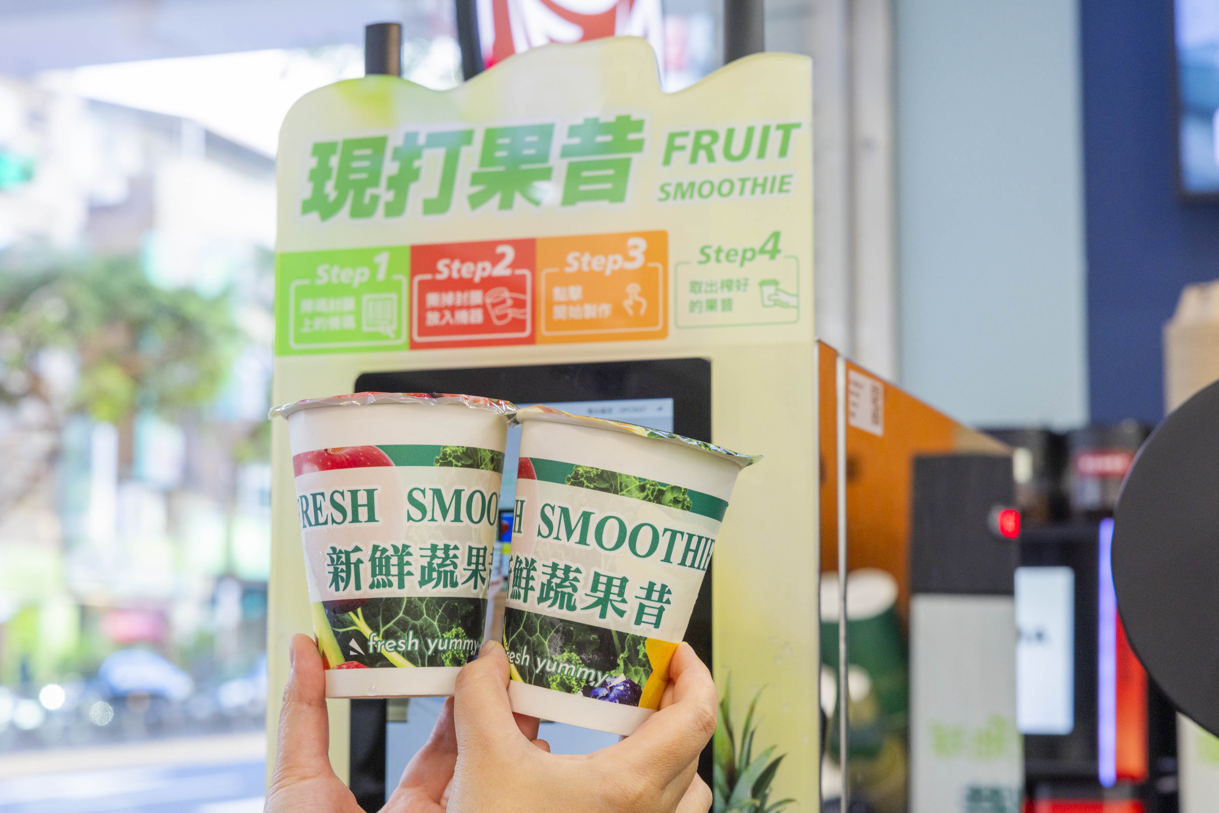 7-ELEVEN首度導入「智能果昔機」,為超商通路獨家機型,機身大小設計符合超商坪效需求,透過專利破壁技術與智慧標準化、自動化精準出杯,只需約90秒就能喝到一杯好喝又風味一致果昔。「智能果昔機」目前限定於欣旺、福正、民欣三家門市24小時販售,消費者到冷凍冰箱挑選果昔商品後至櫃檯結帳,每杯封膜上皆有獨一無二專屬Qrcode,於機台前方掃碼後就可撕膜置入果昔機製作。
