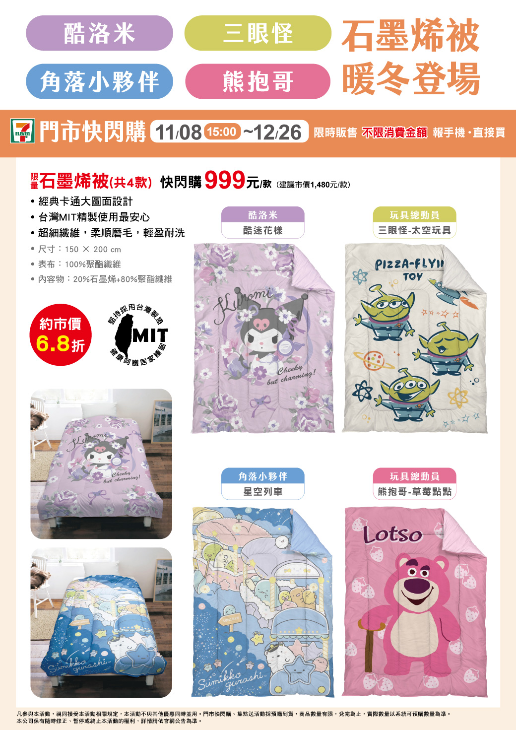 - 門市快閃購限定品項如下:自11/08(三)15:00開始:限量石墨烯被,共4款(酷洛米、三眼怪、角落小夥伴、熊抱哥),前述商品皆含「限量門市快閃購+備品」。