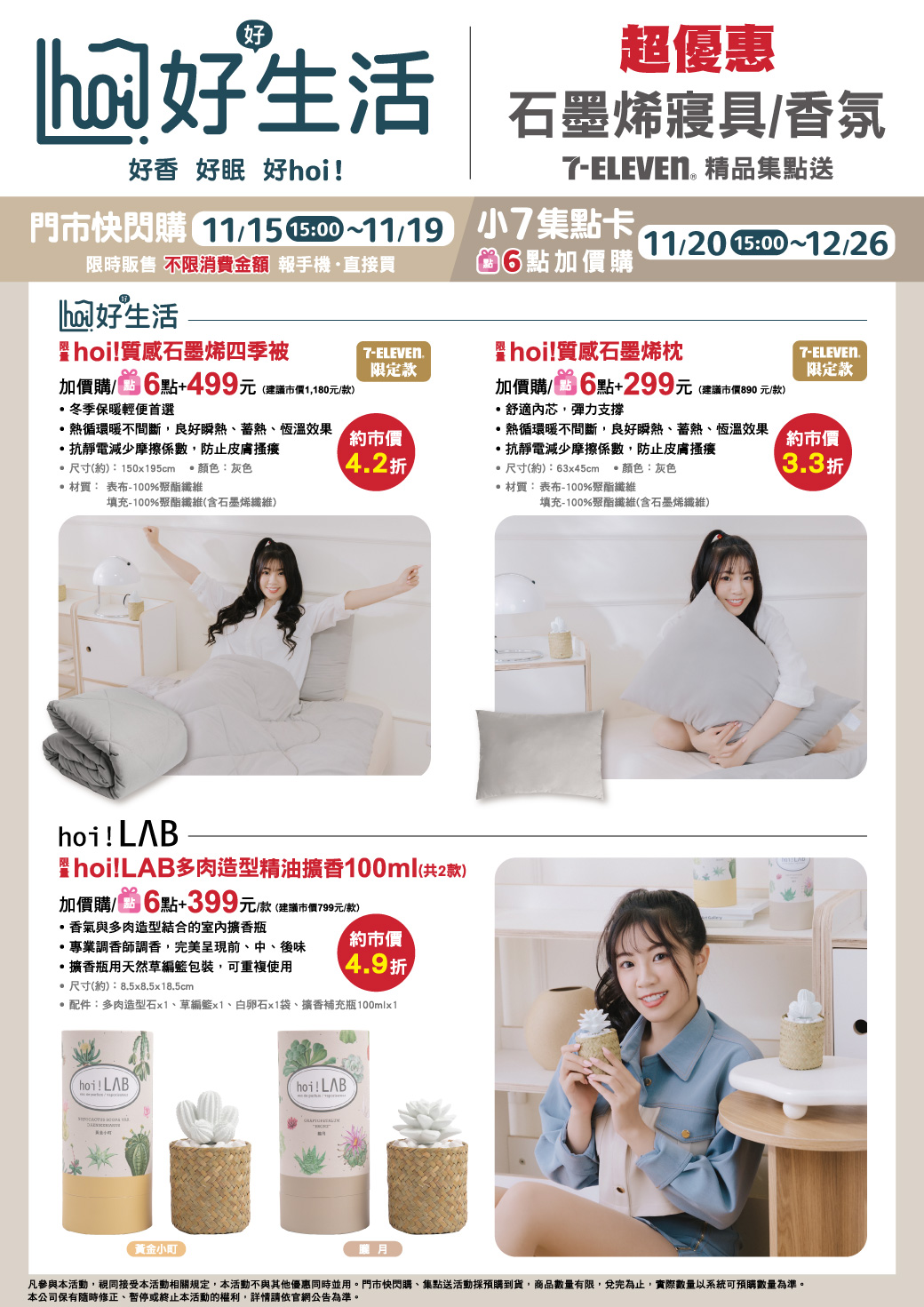 - 下列商品,自11/20(一)15:00開始:限量hoi!質感石墨烯四季被,共1款、限量hoi!質感石墨烯枕,共1款、限量hoi!LAB多肉造型精油擴香100ml,共2款,前述商品皆含「限量門市快閃購+限量集點送兌換+備品」。
