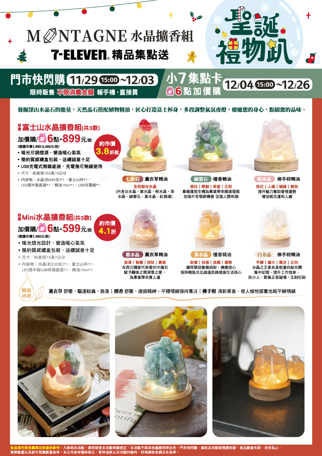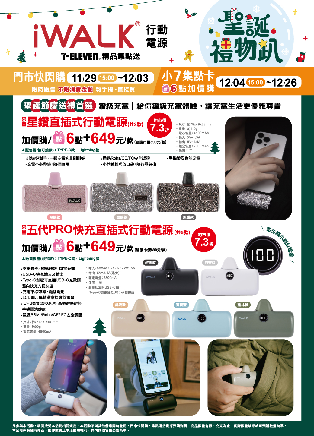 - 下列商品,自12/04(一)15:00開始:限量iWALK星鑽直插式行動電源,共3款、限量iWALK五代PRO快充直插式行動電源,共5款、限量MONTAGNE富士山水晶擴香組,共3款、限量MONTAGNE Mini水晶擴香組,共3款,前述商品皆含「限量門市快閃購+限量集點送兌換+備品」。