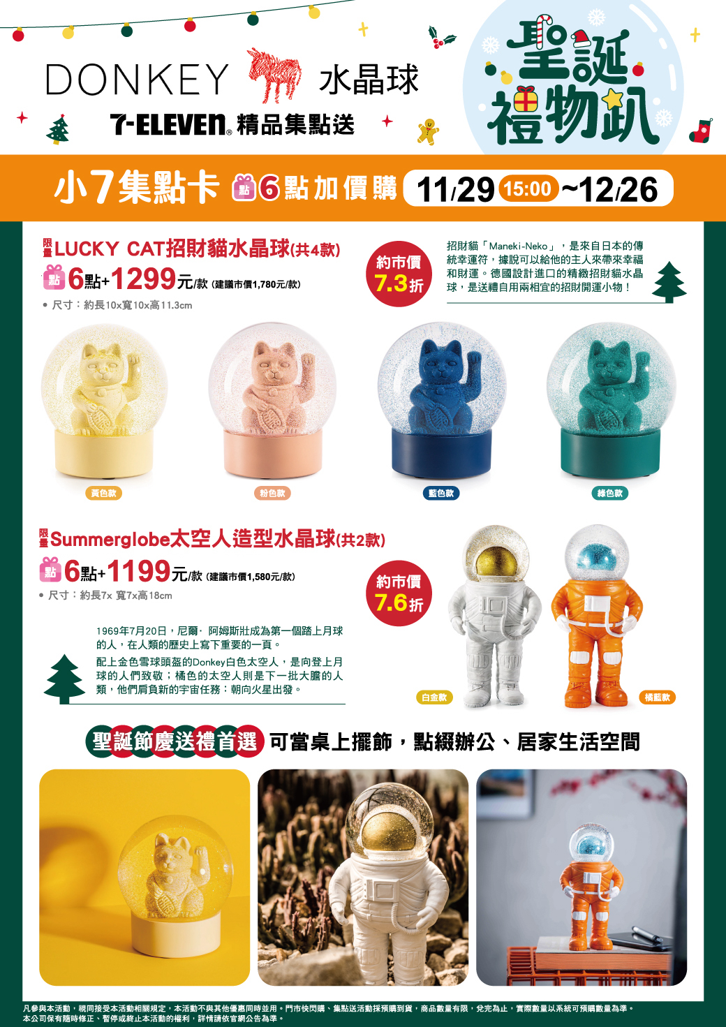 - 下列商品,自11/29(三)15:00開始:限量DONKEY LUCKY CAT招財貓水晶球,共4款、限量DONKEY Summerglobe太空人造型水晶球,共2款,前述商品皆含「限量集點送兌換+備品」。