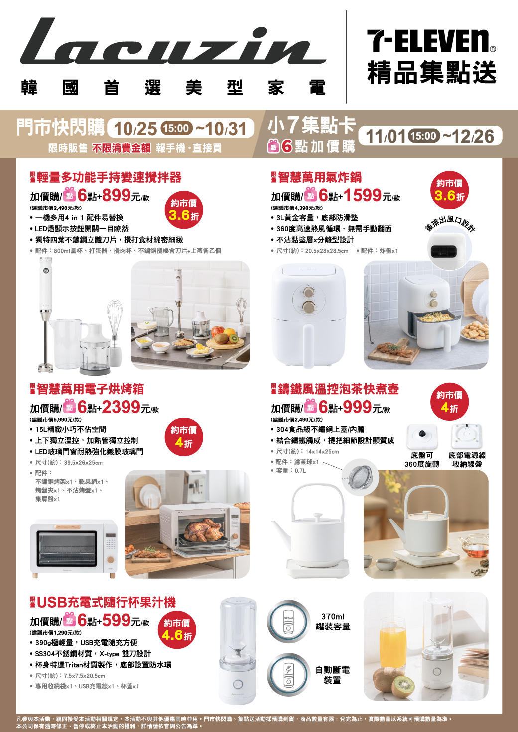 - 門市快閃購限定品項如下:自10/25(三)15:00開始:限量Lacuzin輕量多功能手持變速攪拌器,共1款、限量Lacuzin智慧萬用氣炸鍋,共1款、限量Lacuzin智慧萬用電子烘烤箱,共1款、限量Lacuzin鑄鐵風溫控泡茶快煮壺,共1款、限量Lacuzin USB充電式隨行杯果汁機,共1款,前述商品皆含「限量門市快閃購+限量集點送兌換+備品」。