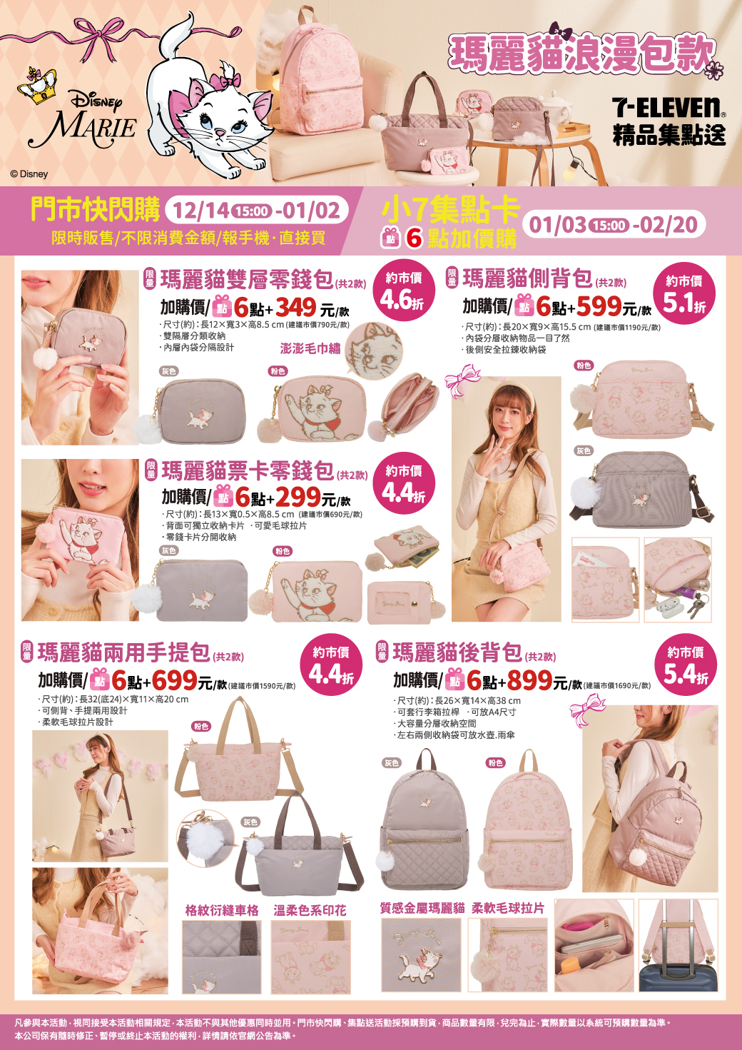 - 下列商品,自01/03(三)15:00開始:限量瑪麗貓雙層零錢包,共2款、限量瑪麗貓側背包,共2款、限量瑪麗貓票卡零錢包,共2款、限量瑪麗貓兩用手提包,共2款、限量瑪麗貓後背包,共2款,前述商品皆含「限量門市快閃購+限量集點送兌換+備品」。