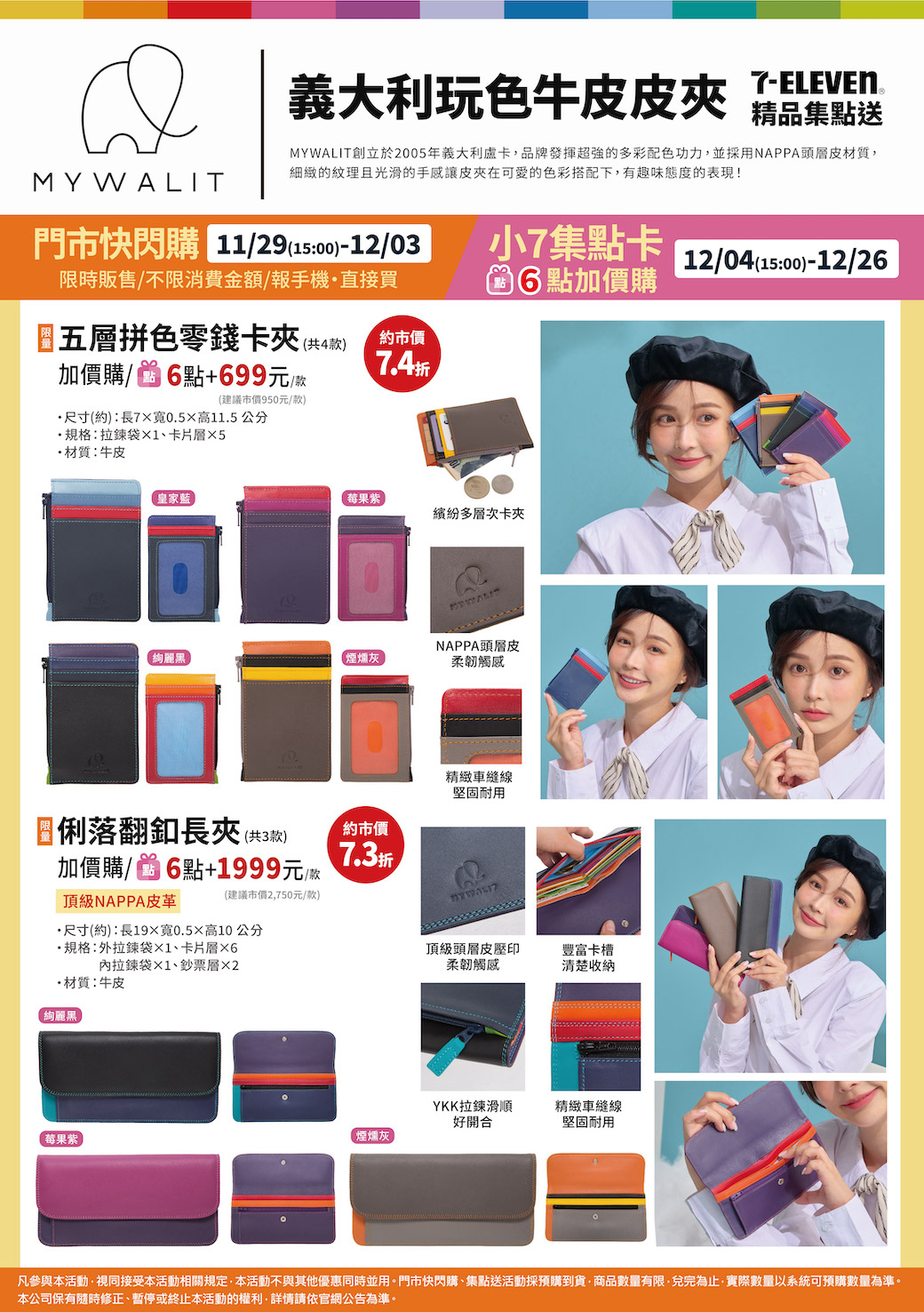 - 門市快閃購限定品項如下:自11/29(三)15:00開始:限量五層拼色零錢卡夾,共4款、限量俐落翻扣長夾,共3款,前述商品皆含「限量門市快閃購+限量集點送兌換+備品」。