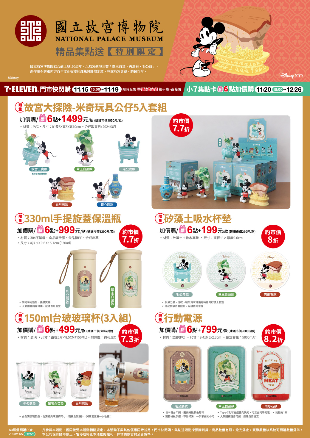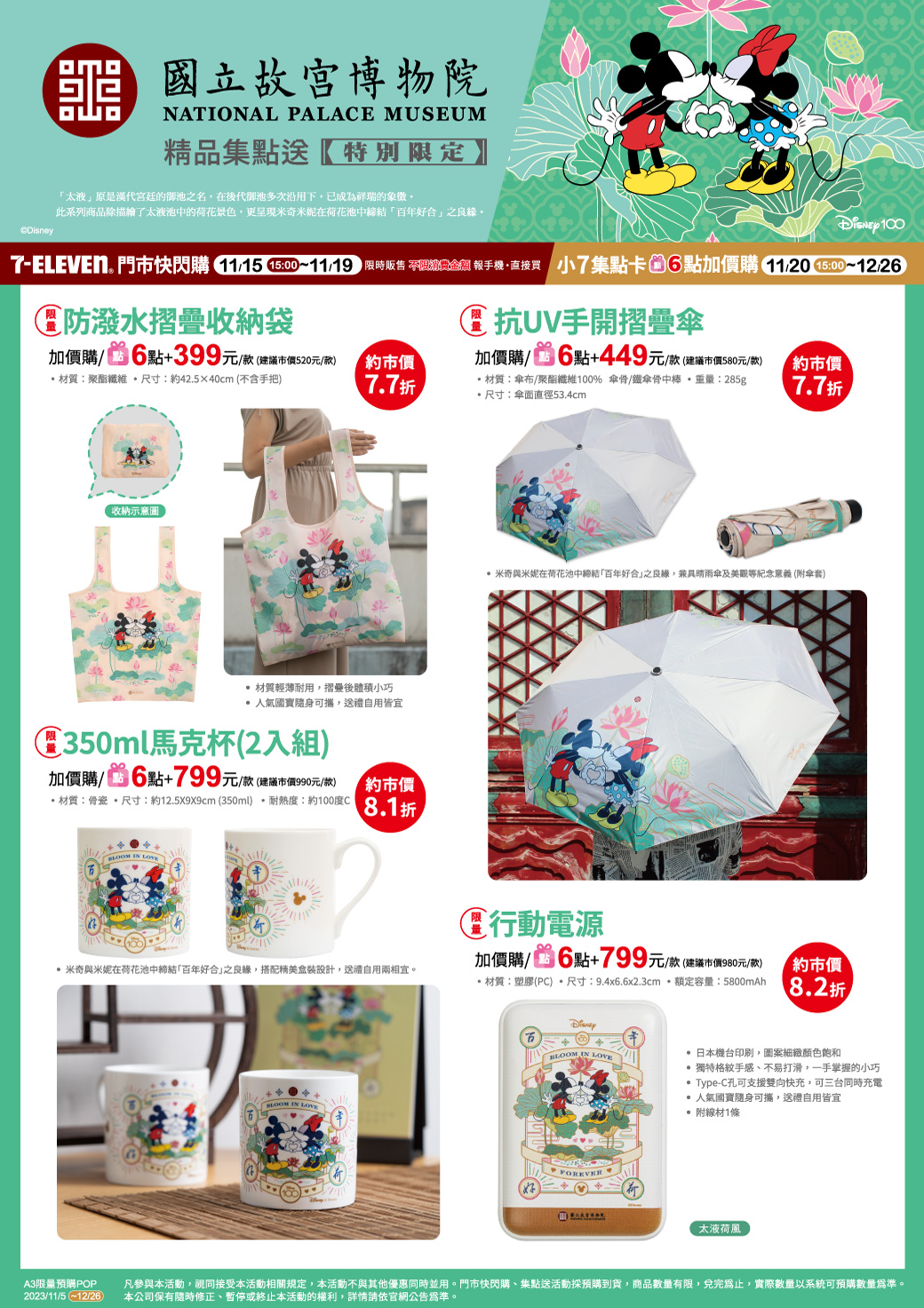 - 下列商品,自11/20(一)15:00開始:限量故宮大探險-米奇玩具公仔5入套組,共1款、限量330ml手提旋蓋保溫瓶,共2款、限量矽藻土吸水杯墊,共3款、限量150ml台玻玻璃杯組(3入組),共1款、限量行動電源,共3款(毛公鼎款、翠玉白菜款、肉形石款)、限量防潑水摺疊收納袋,共1款、限量抗UV手開摺疊傘、限量350ml馬克杯(2入組),共1款、限量行動電源,共1款(太液荷風),前述商品皆含「限量門市快閃購+限量集點送兌換+備品」。