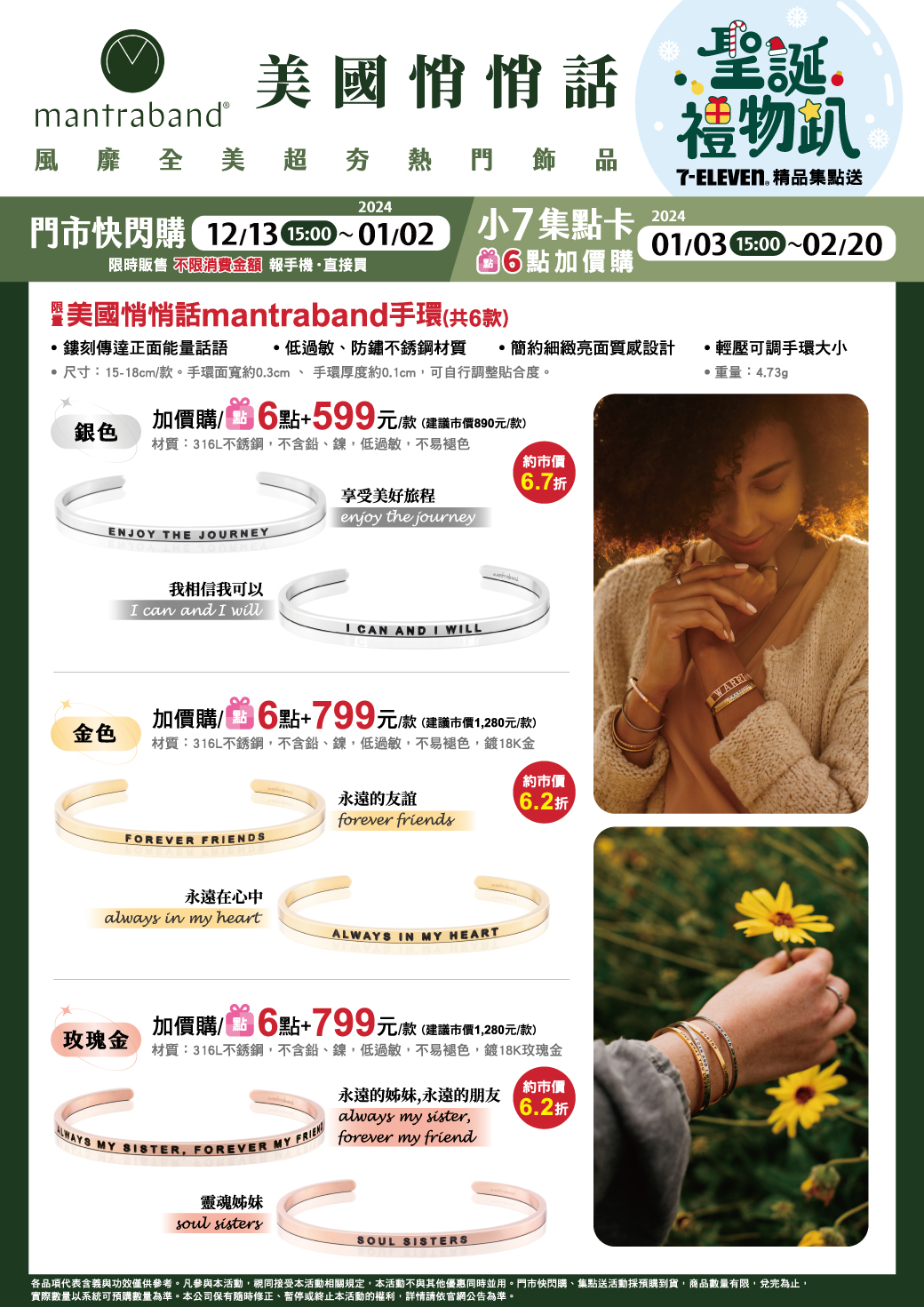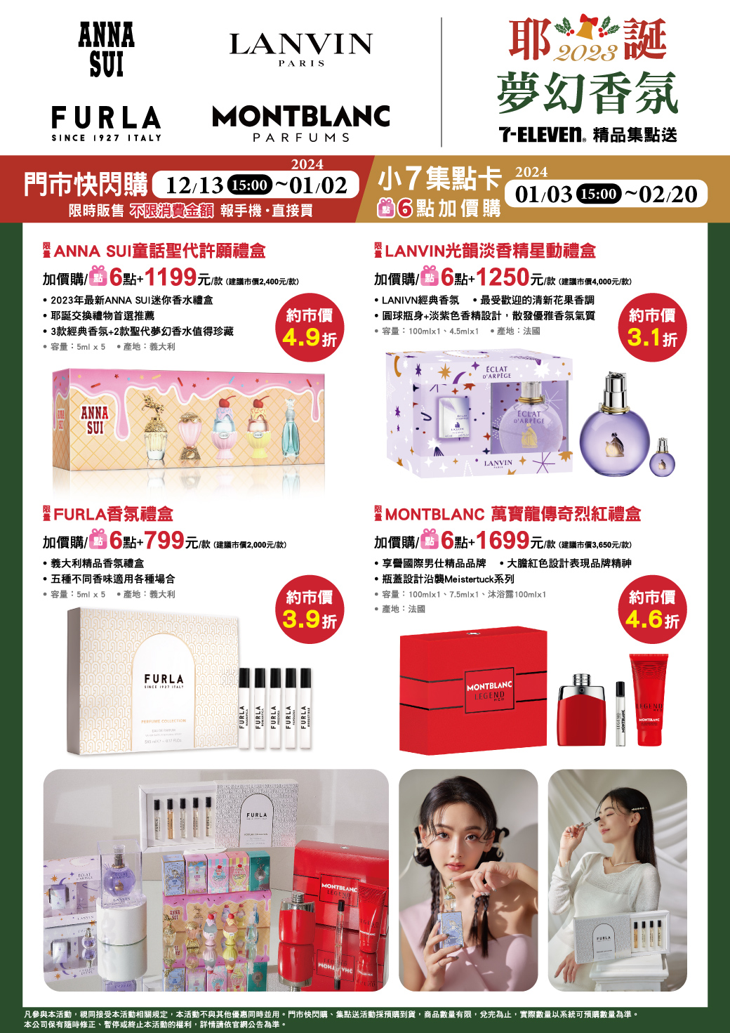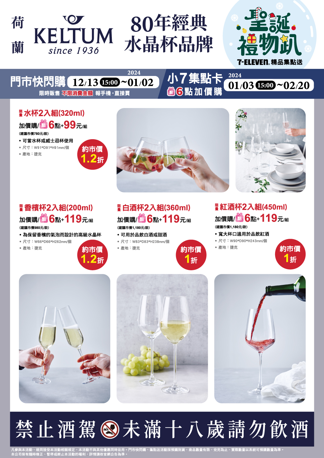 - 門市快閃購限定品項如下:自12/13(三)15:00開始:限量ANNA SUI童話聖代許願禮盒,共1款、限量LANVIN光韻淡香精星動禮盒,共1款、限量FURLA香氛禮盒,共1款、限量MONTBLANC萬寶龍傳奇烈紅禮盒,共1款、限量美國悄悄話mantrsband手環,共6款、限量KELTUM水杯2入組(320ml),共1款、限量KELTUM香檳杯2入組(200ml),共1款、限量KELTUM白酒杯2入組(360ml),共1款、限量KELTUM紅酒杯2入組(450ml),共1款,前述商品皆含「限量門市快閃購+限量集點送兌換+備品」。