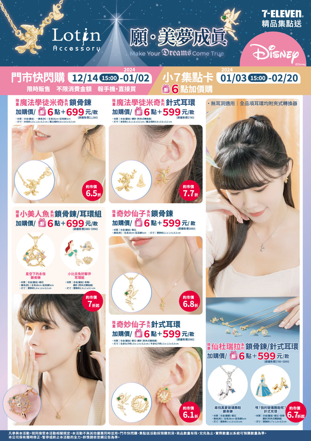 - 門市快閃購限定品項如下:自12/14(四)15:00開始:限量Lotin魔法學徒米奇系列鎖骨鏈,共1款、限量Lotin魔法學徒米奇系列針式耳環,共1款、限量Lotin小美人魚系列鎖骨鏈/耳環組,各1款、限量Lotin奇妙仙子系列鎖骨鏈,共1款、限量Lotin奇妙仙子系列針式耳環,共1款、限量Lotin仙杜瑞拉系列鎖骨鏈/針式耳環,各1款,前述商品皆含「限量門市快閃購+限量集點送兌換+備品」。