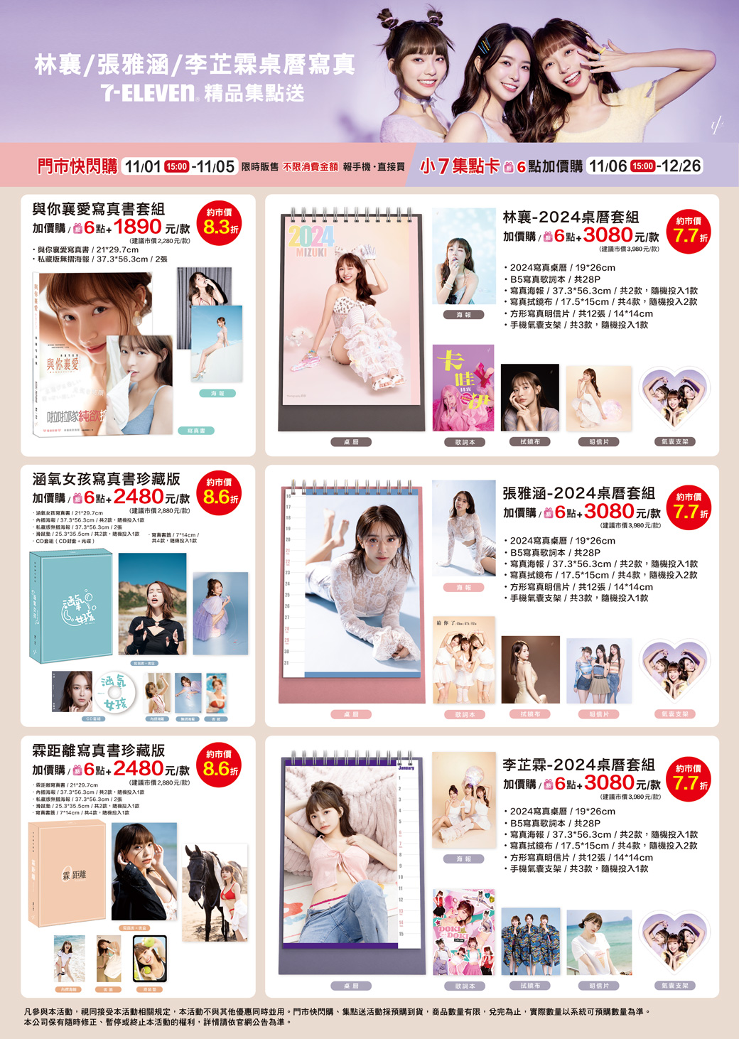 - 下列商品,自11/06(一)15:00開始:限量林襄-2024桌曆套組,共1款、限量與你襄愛寫真書套組,共1款、限量張雅涵-2024桌曆套組,共1款、限量涵氧女孩寫真書珍藏版,共1款、限量李芷霖-2024桌曆套組,共1款、限量霖距離寫真書珍藏版,共1款,前述商品皆含「限量門市快閃購+限量集點送兌換+備品」。