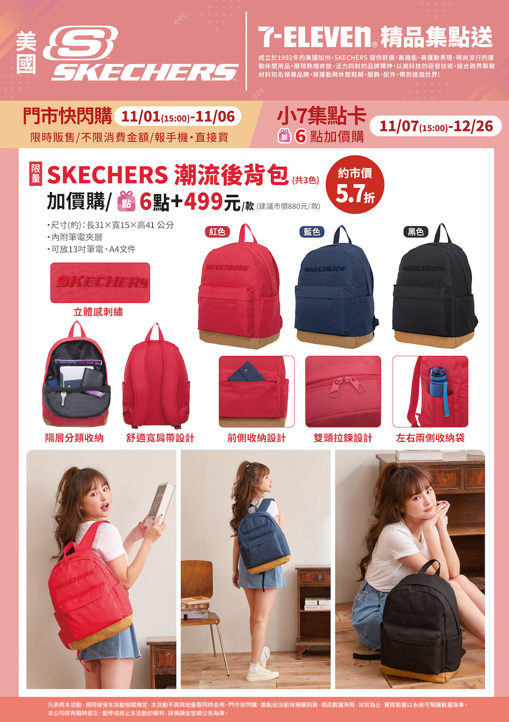- 下列商品,自11/07(二)15:00開始:限量SKECHERS潮流後背包,共3色,前述商品皆含「限量門市快閃購+限量集點送兌換+備品」。