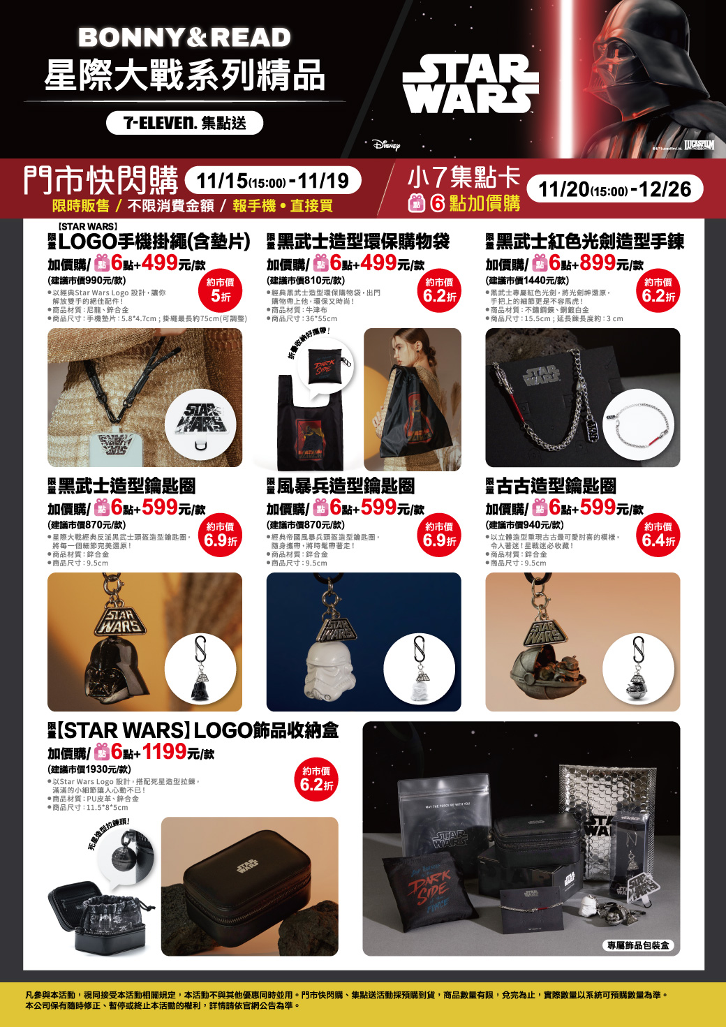 - 門市快閃購限定品項如下:自11/15(三)15:00開始至11/19:限量STAR WARS LOGO手機掛繩(含墊片),共1款、限量黑武士造型環保購物袋,共1款、限量黑武士紅色光劍造型手鍊,共1款、限量黑武士造型鑰匙圈,共1款、限量風暴兵造型鑰匙圈,共1款、限量古古造型鑰匙圈,共1款、限量【STAR WARS】LOGO飾品收納盒,共1款,前述商品皆含「限量門市快閃購+限量集點送兌換+備品」。