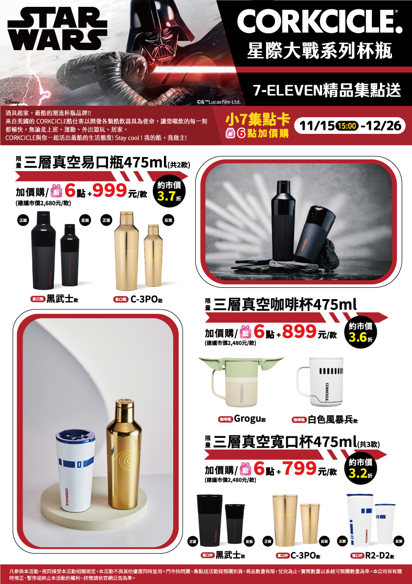 - 下列商品,自11/20(一)15:00開始至12/24(日),兌換至2023/12/26:限量STAR WARS LOGO手機掛繩(含墊片),共1款、限量黑武士造型環保購物袋,共1款、限量黑武士紅色光劍造型手鍊,共1款、限量黑武士造型鑰匙圈,共1款、限量風暴兵造型鑰匙圈,共1款、限量古古造型鑰匙圈,共1款、限量【STAR WARS】LOGO飾品收納盒,共1款,前述商品皆含「限量門市快閃購+限量集點送兌換+備品」。