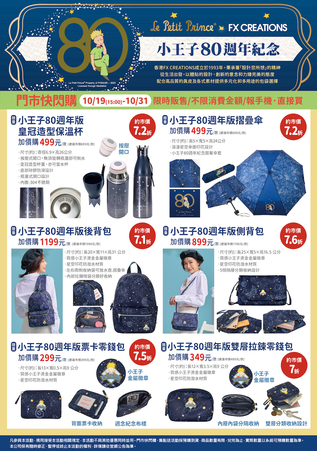 - 門市快閃購限定品項如下:自10/19(四)15:00開始至10/31(二):限量小王子80週年版皇冠造型保溫杯,共1款、限量小王子80週年版摺疊傘,共1款、限量小王子80週年版後背包,共1款、限量小王子80週年版側背包,共1款、限量小王子80週年版票卡零錢包,共1款、限量小王子80週年版雙層拉鍊零錢包,共1款,前述商品皆含「限量門市快閃購+備品」。