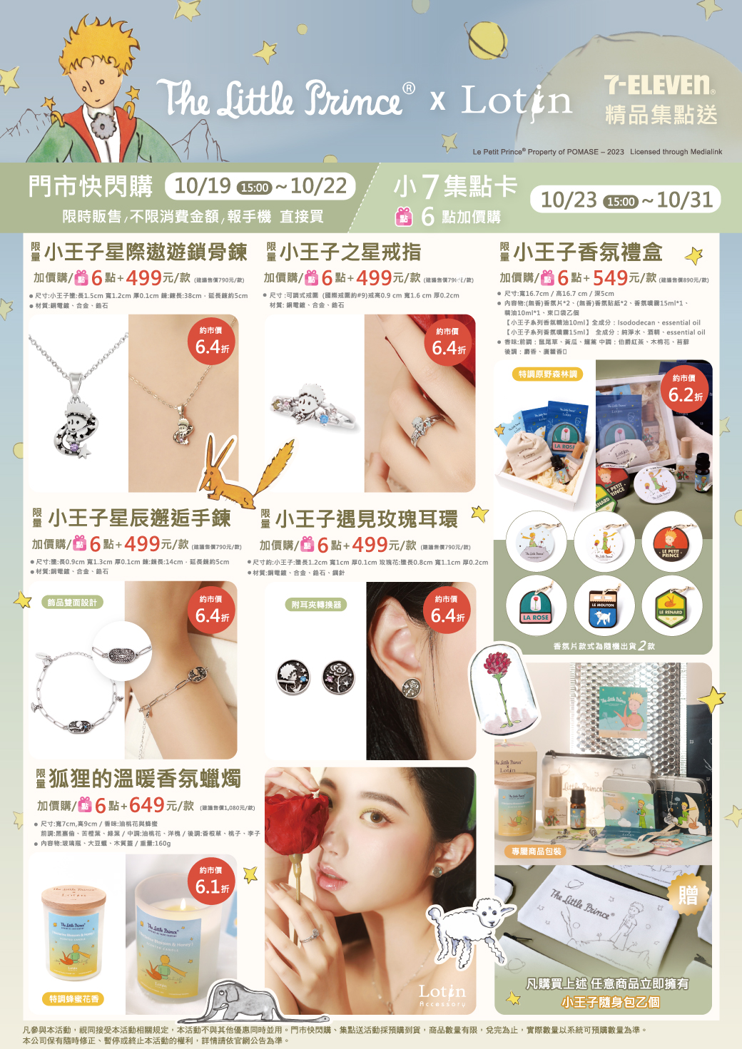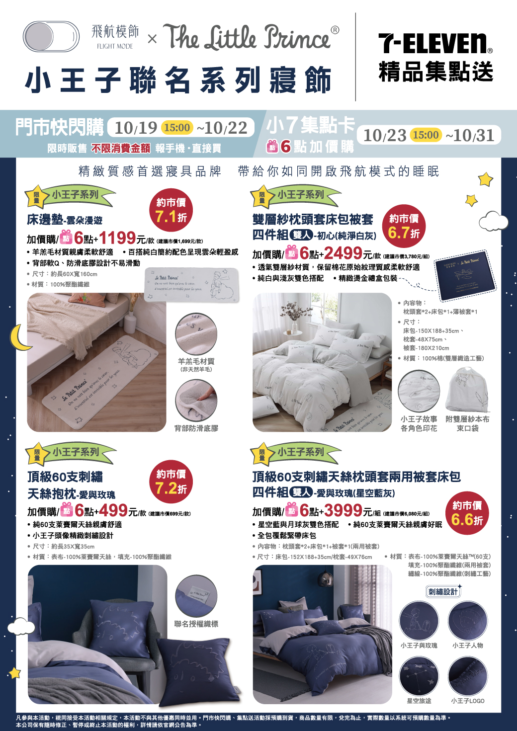 - 門市快閃購限定品項如下:自10/19(四)15:00開始至10/22(日):限量小王子星際遨遊鎖骨練,共1款、限量小王子之星戒指,共1款、限量小王子星辰邂逅手鍊,共1款、限量小王子遇見玫瑰耳環,共1款、限量小王子香氛禮盒,共1款、限量狐狸的溫暖香氛蠟燭,共1款、限量小王子系列床邊墊-雲朵漫遊,共1款、限量小王子系列雙層紗織枕頭套床包被套四件組(雙人)-初心 純淨灰白,共1款、限量小王子系列頂級60支刺繡天絲抱枕-愛與玫瑰,共1款、限量小王子系列頂級60支刺繡天絲枕頭套兩用被套床包四件組(雙人)-愛與玫瑰 星空藍灰,共1款,前述商品皆含「限量門市快閃購+限量集點送兌換+備品」。