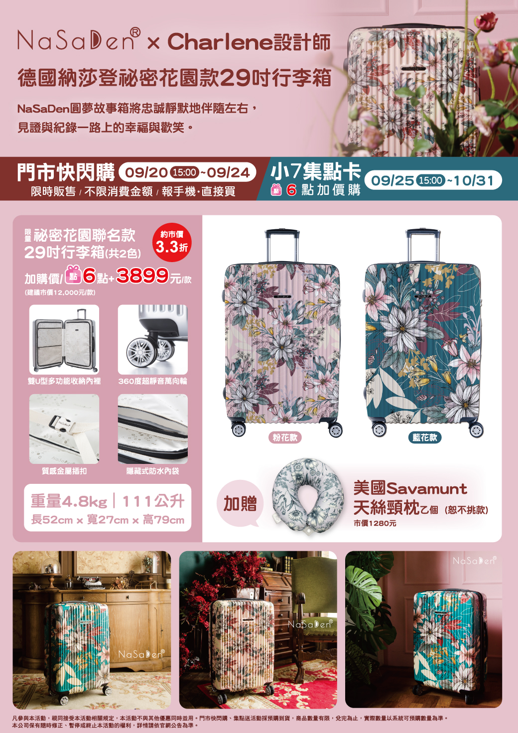- 下列商品,自09/25(一)15:00開始:限量祕密花園聯名款29吋行李箱,共2色(加贈美國Savamunt天絲頸枕乙個,恕不挑款),前述商品皆含「限量門市快閃購+限量集點送兌換+備品」。