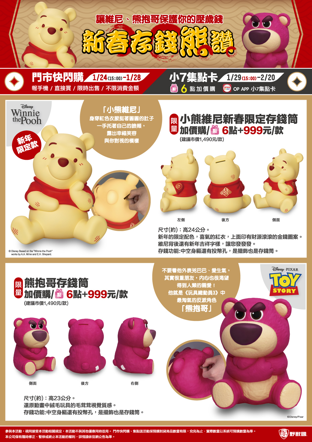 - 門市快閃購限定品項如下:自01/24(三)15:00開始:限量小熊維尼新春限定存錢筒,共1款、限量熊抱哥存錢筒,共1款,前述商品皆含「限量門市快閃購+限量集點送兌換+備品」。