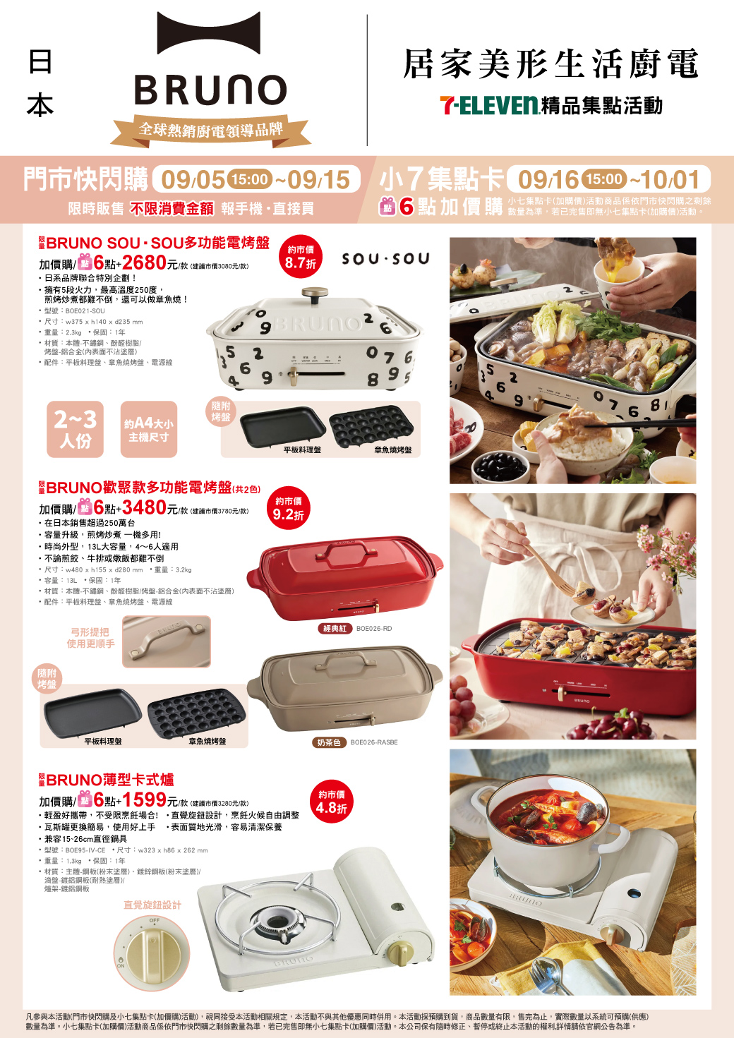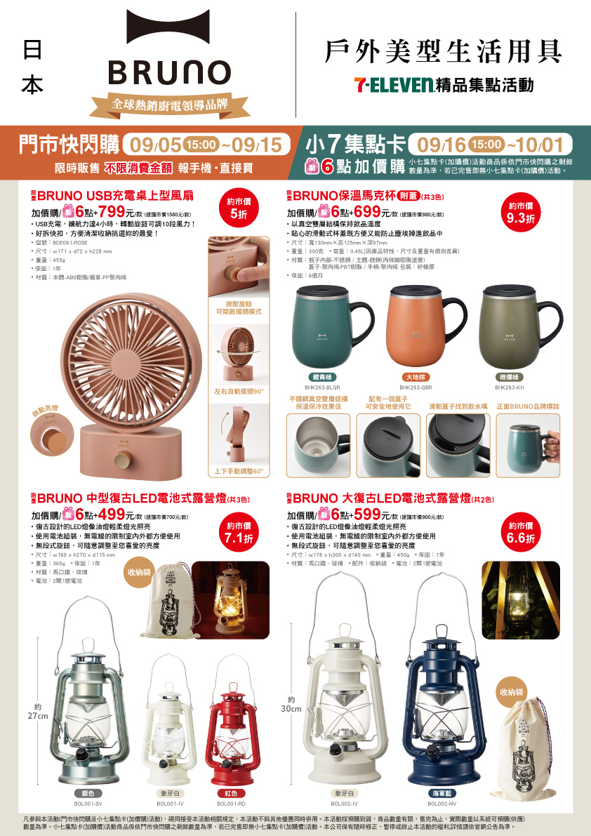 - 門市快閃購限定品項如下:自09/05(四)15:00開始至09/15(日):限量BRUNO SOU.SOU多功能電烤盤,共1款、限量BRUNO歡聚款多功能電烤盤,共2款、限量BRUNO薄型卡式爐,共1款、限量BRUNO USB充電桌上型風扇,共1款、限量BRUNO保溫馬克杯(附蓋),共3款、限量BRUNO中型復古LED電池式露營燈,共3款、限量BRUNO大復古LED電池式露營燈,共2款,前述商品皆含「限量門市快閃購+限量集點送兌換+備品」。