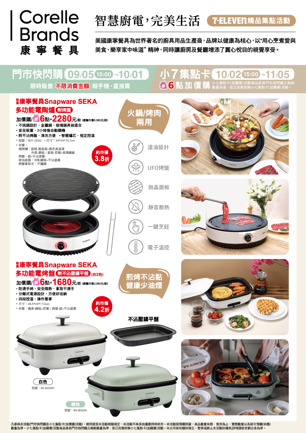 - 門市快閃購限定品項如下:自09/05(四)15:00開始至10/01(二):限量康寧餐具Snapware SEKA多功能電陶爐(附烤盤),共1款、限量康寧餐具Snapware SEKA多功能電烤盤(附不沾壓鑄平盤),共2款,前述商品皆含「限量門市快閃購+限量集點送兌換+備品」。