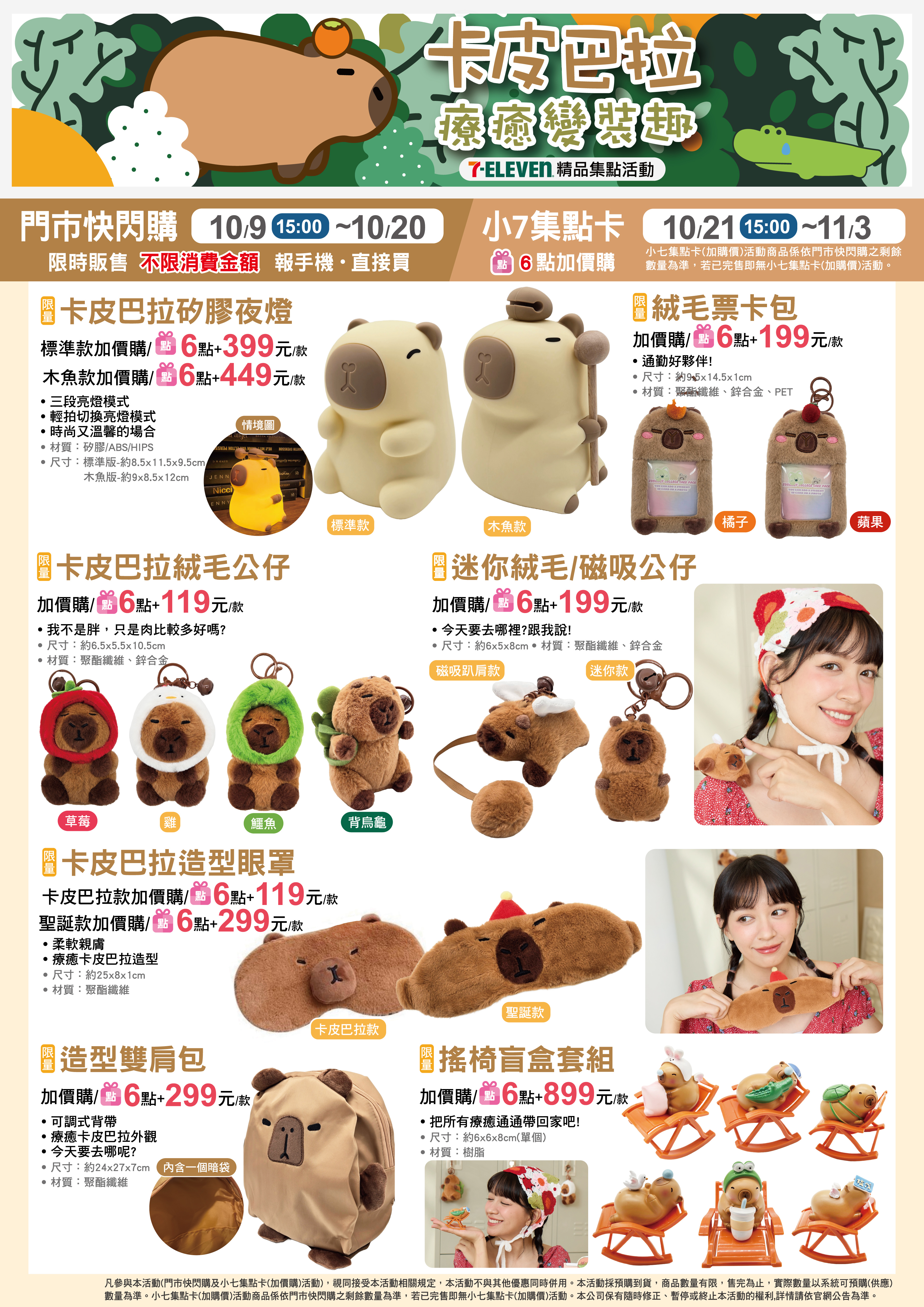 - 下列商品,自10/21(一)15:00開始:限量卡皮巴拉矽膠夜燈,共2款、限量卡皮巴拉絨毛票卡包,共2款、限量卡皮巴拉絨毛公仔,共4款、限量卡皮巴拉造型眼罩,共2款、限量迷你絨毛/磁吸公仔,共2款、限量造型雙肩包,共1款、限量搖椅盲盒套組,共1款,前述商品皆含「限量門市快閃購+限量集點送兌換+備品」。