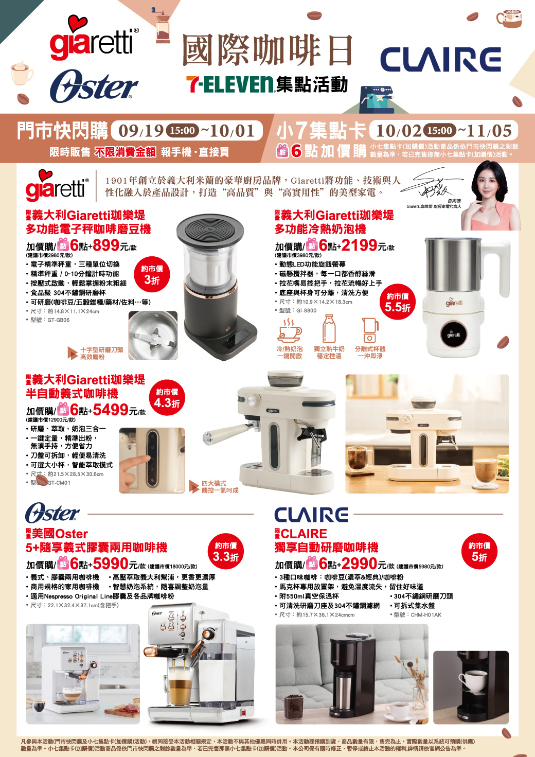 - 下列商品,自10/02(三)15:00開始:限量義大利Giaretti珈樂堤多功能電子秤咖啡磨豆機,共1款、限量義大利Giaretti珈樂堤多功能冷熱奶泡機,共1款、限量義大利Giaretti珈樂堤半自動義式咖啡機,共1款、限量美國Oster 5+隨享義式膠囊兩用咖啡機,共1款、限量CLAIRE獨享自動研磨咖啡機,共1款,前述商品皆含「限量門市快閃購+限量集點送兌換+備品」。