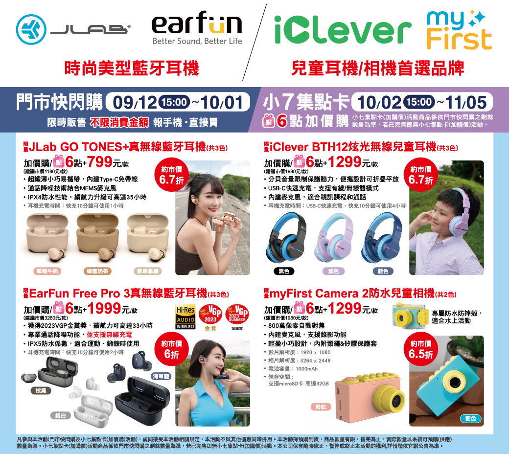 下列商品,自10/02(三)15:00開始:限量JLab GO TONES+真無線藍牙耳機,共3款、限量iClever BTH12炫光無線兒童耳機,共3款、限量EarFun Free Pro 3真無線藍牙耳機,共3款、限量myFirst Camera 2防水兒童相機,共2款,前述商品皆含「限量門市快閃購+限量集點送兌換+備品」。