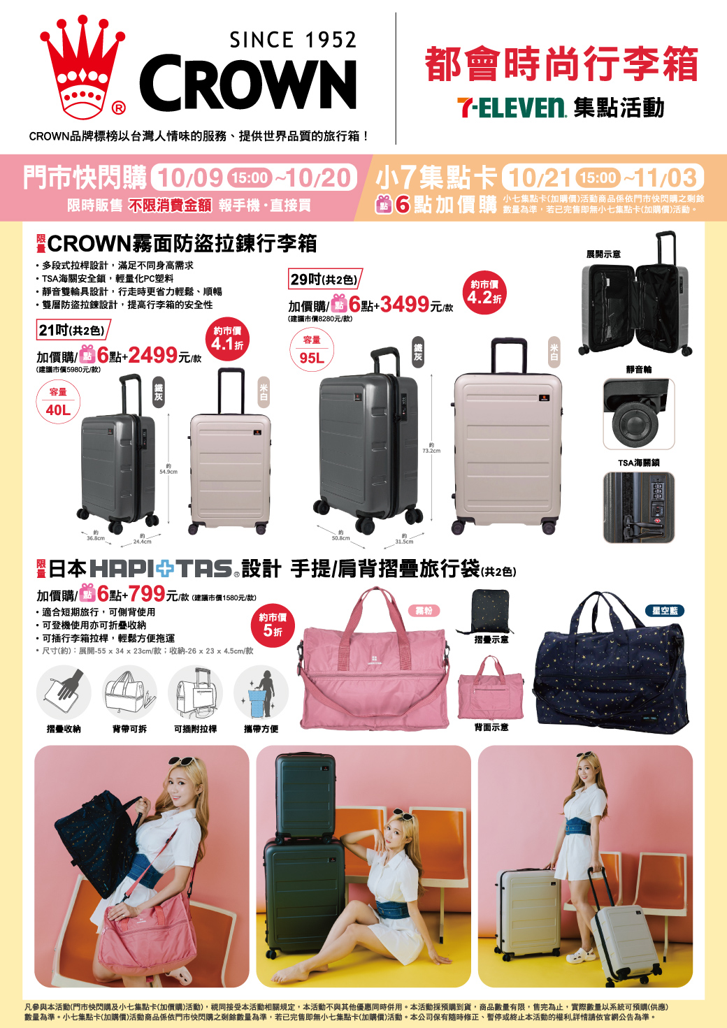 - 下列商品,自10/21(一)15:00開始:限量KANGOL帆布皮革包-小提包,共2款、限量KANGOL帆布皮革包-托特包,共2款、限量KANGOL帆布皮革包-側背包,共2款、限量KANGOL運動型行李箱28吋,共2款、限量KANGOL百搭厚底洞洞鞋,共2款、限量KANGOL山系中性帽T,共2款、限量CROWN霧面防盜拉鍊行李箱21吋,共2款、限量CROWN霧面防盜拉鍊行李箱29吋,共2款、限量日本HAPI+TAS設計手提/肩背摺疊旅行袋,共2款,前述商品皆含「限量門市快閃購+限量集點送兌換+備品」。