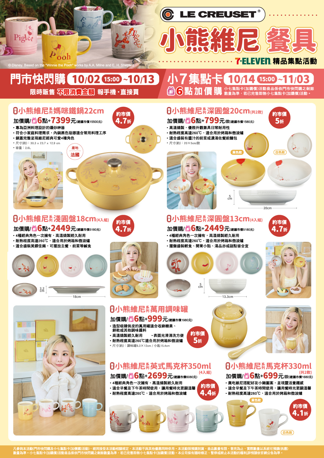 - 下列商品,自10/14(一)15:00開始:限量小熊維尼系列媽咪鐵鍋22cm,共1款、限量小熊維尼系列深圓盤20cm,共2款、限量小熊維尼系列淺圓盤18cm(4入組),共1款、限量小熊維尼系列深圓盤13cm(4入組),共1款、限量小熊維尼系列萬用調味罐,共1款、限量小熊維尼系列英式馬克杯350ml(4入組),共1款、限量小熊維尼系列馬克杯330ml,共2款,前述商品皆含「限量門市快閃購+限量集點送兌換+備品」。