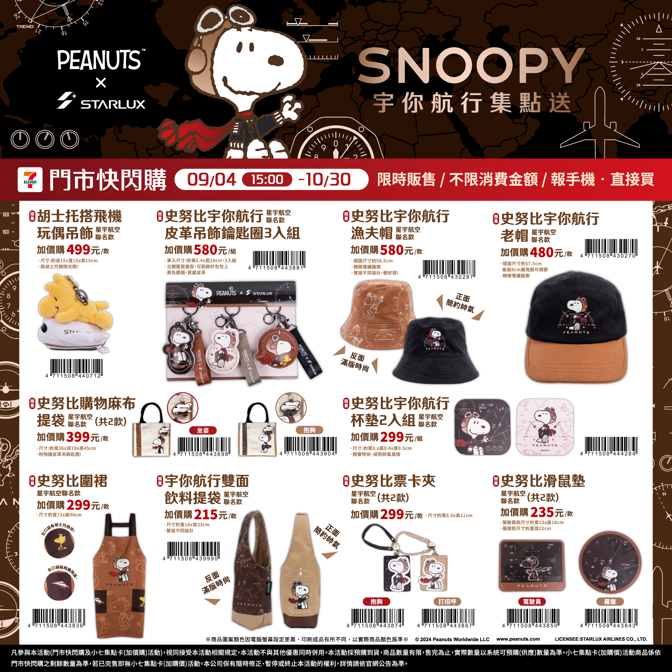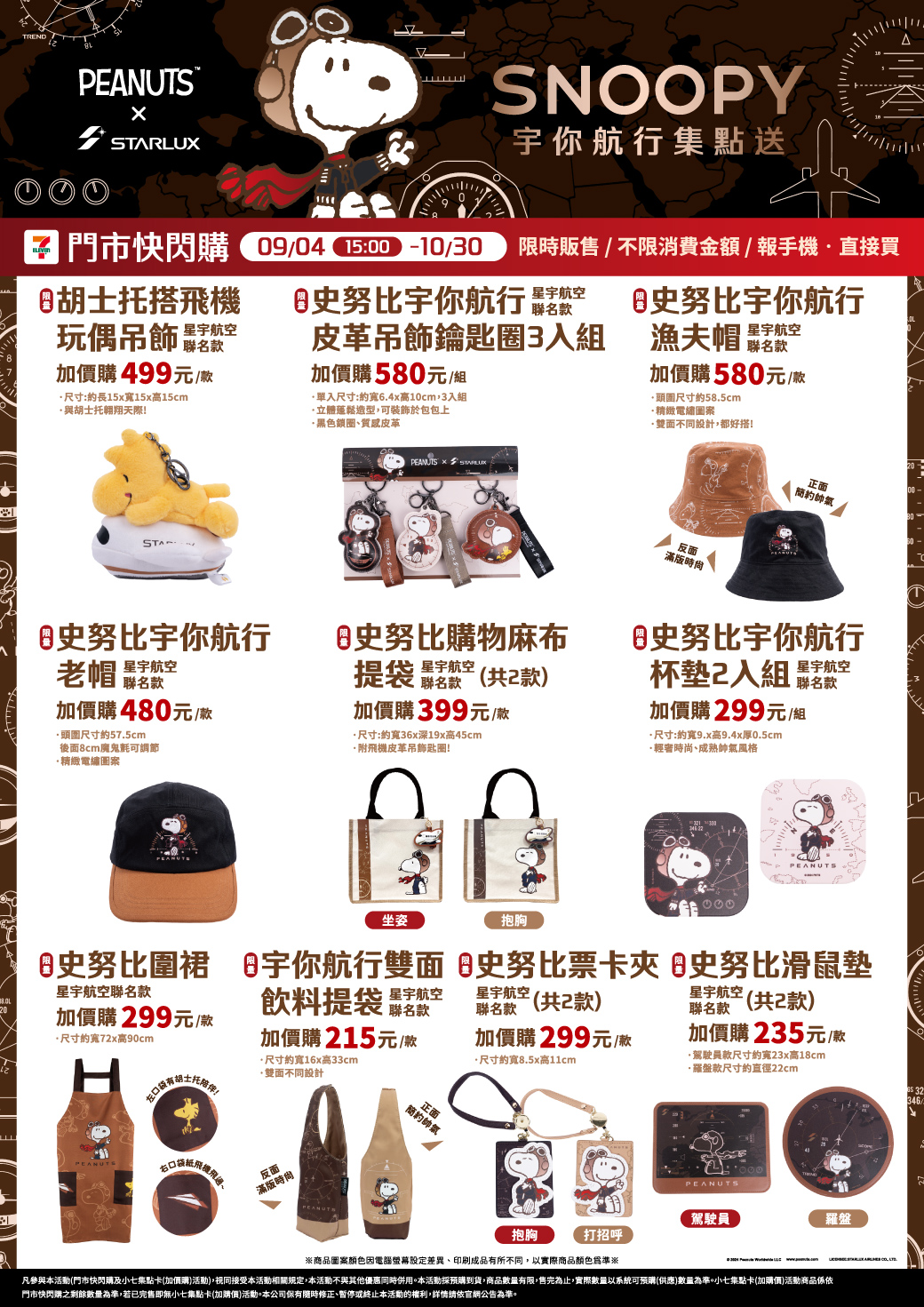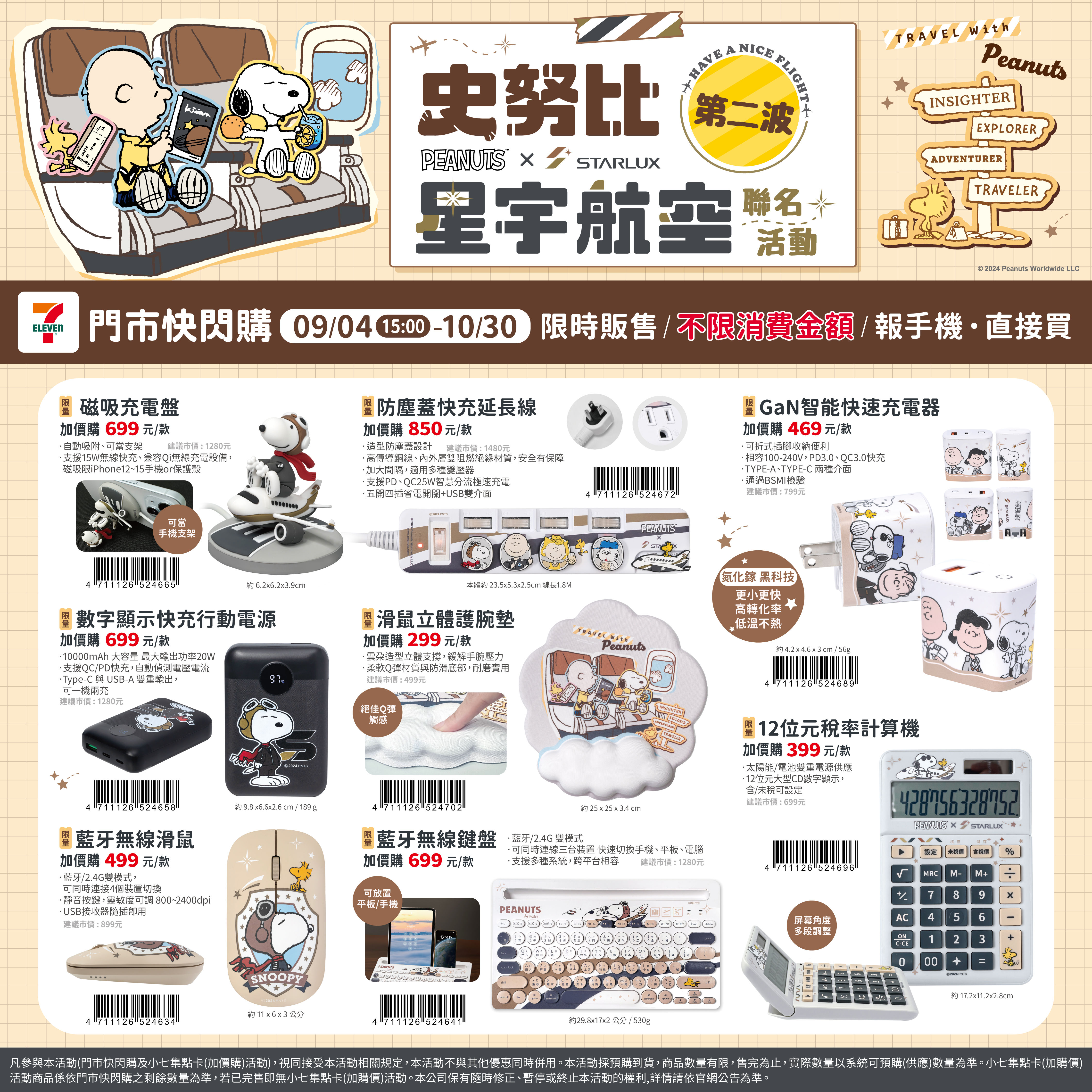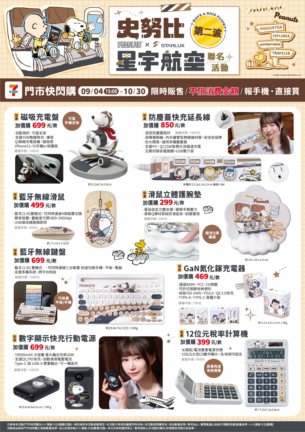 - 門市快閃購限定品項如下:自09/04(三)15:00開始至10/30(三):限量磁吸充電盤,共1款、限量防塵蓋快充延長線,共1款、限量藍牙無線滑鼠,共1款、限量藍牙無線鍵盤,共1款、限量滑鼠立體護腕墊,共1款、限量GaN氮化鎵充電器,共1款、限量12位元稅率計算機、限量數字顯示快充行動電源,共1款、胡士托搭飛機玩偶吊飾(星宇航空聯名款),共1款、限量史努比宇你航行皮革吊飾鑰匙圈3入組(星宇航空聯名款),共1款、限量史努比宇你航行漁夫帽(星宇航空聯名款),共1款、限量史努比宇你航行老帽(星宇航空聯名款),共1款、限量史努比購物帆布提袋(星宇航空聯名款),共2款、限量史努比宇你航行杯墊2入組(星宇航空聯名款),共1款、限量史努比圍裙(星宇航空聯名款),共1款、限量宇你航行雙面飲料提袋(星宇航空聯名款),共1款、限量史努比票卡夾(星宇航空聯名款),共2款、限量史努比滑鼠墊(星宇航空聯名款),共2款、限量史努比45cm看門狗玩偶,共3款、限量史努比18cm看門狗玩偶,共3款、限量史努比28吋前開上掀式行李箱,共2款,前述商品皆含「限量門市快閃購+備品」。
