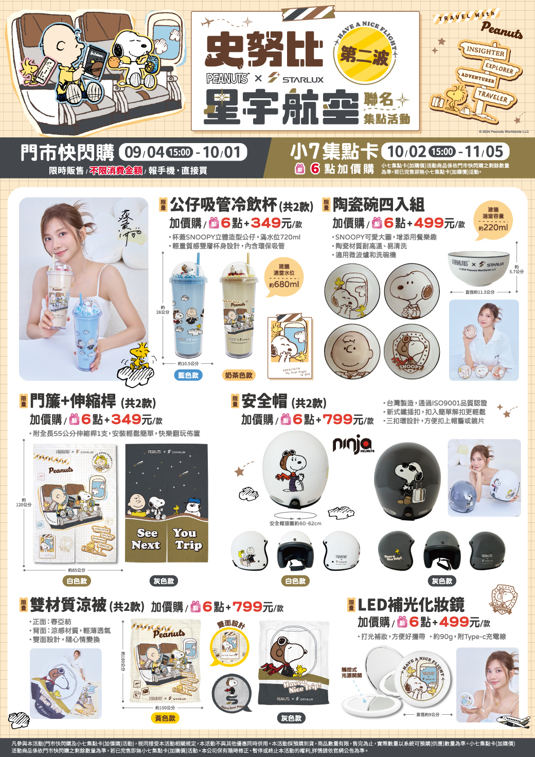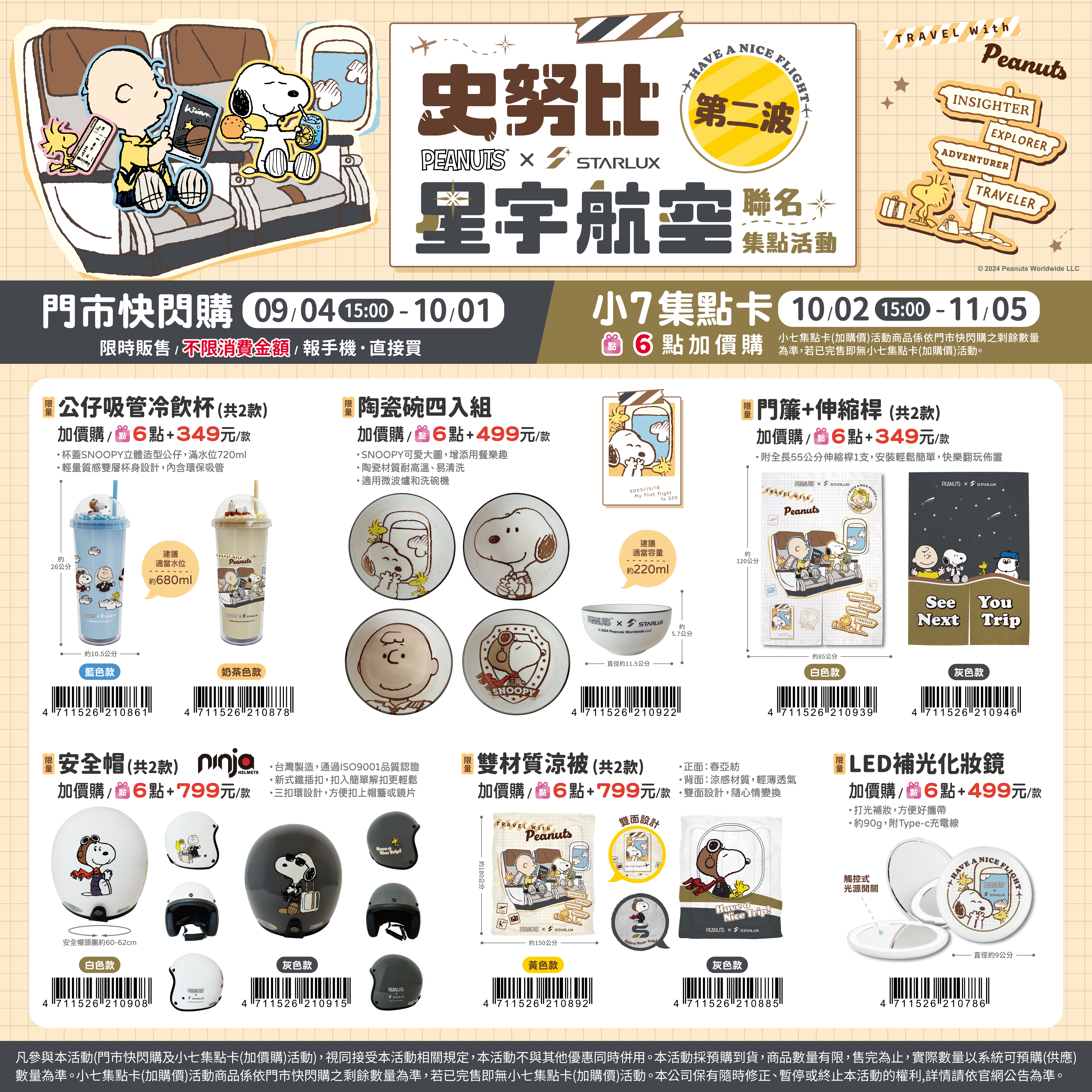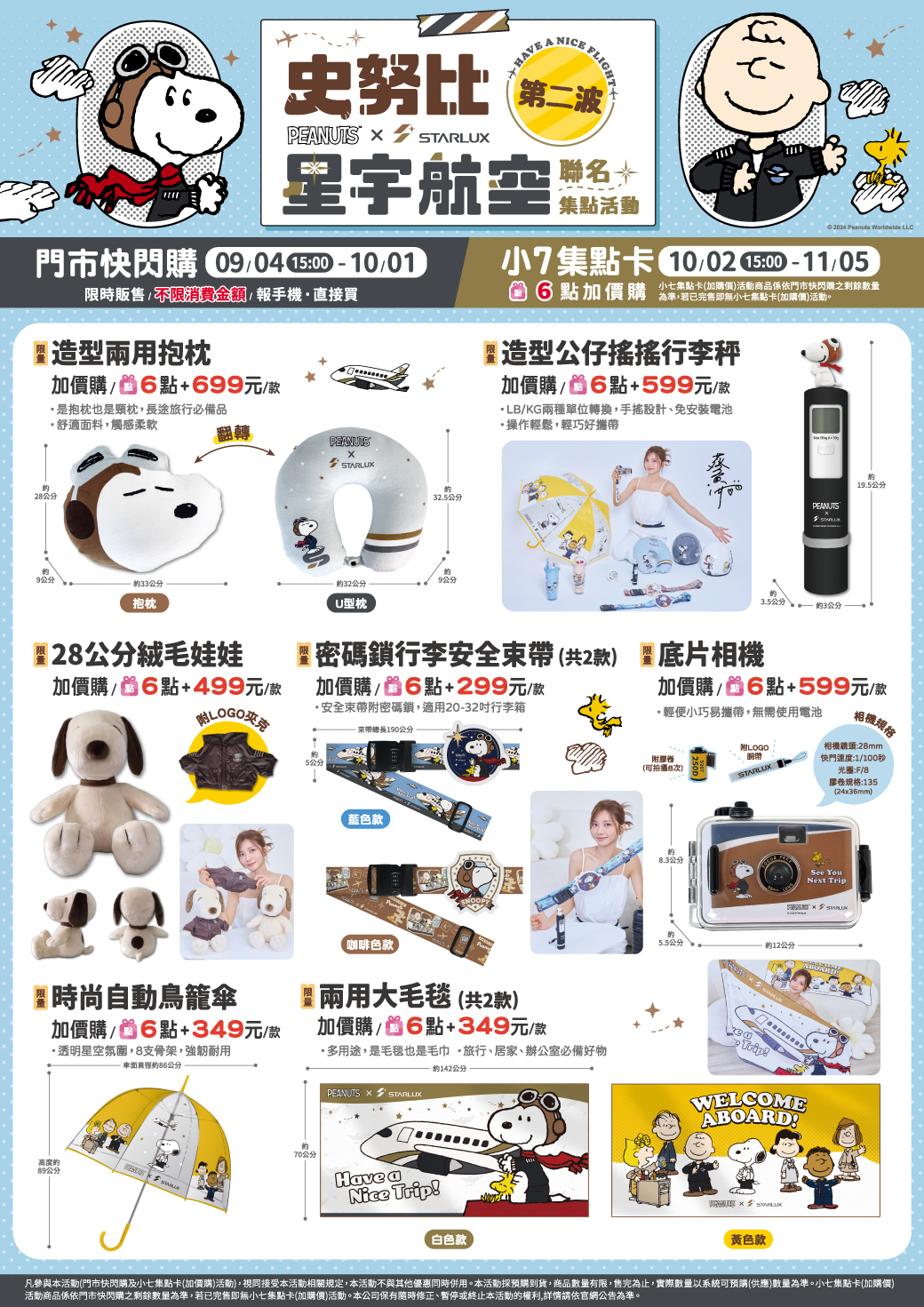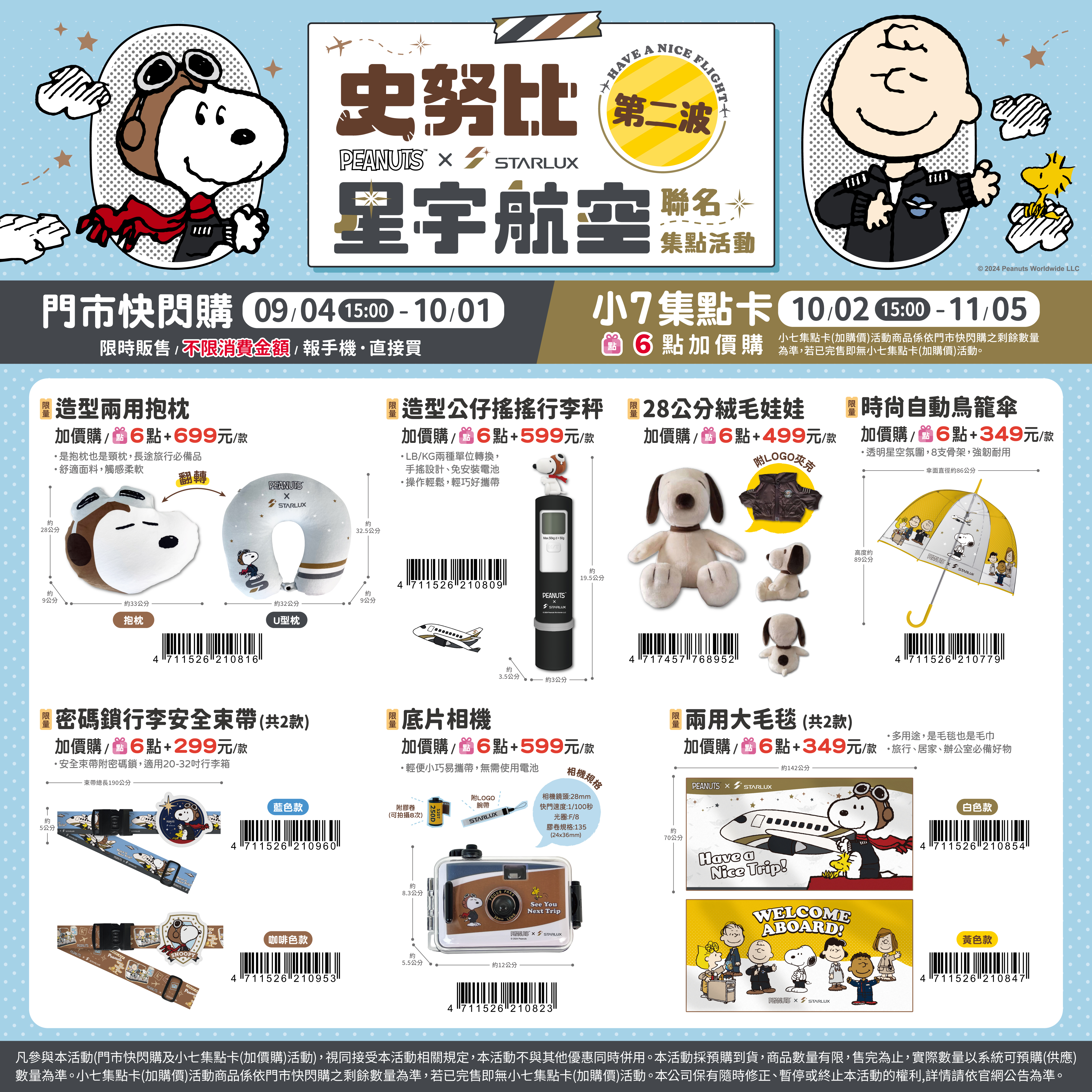 - 門市快閃購限定品項如下:自09/04(三)15:00開始至10/30(三):限量磁吸充電盤,共1款、限量防塵蓋快充延長線,共1款、限量藍牙無線滑鼠,共1款、限量藍牙無線鍵盤,共1款、限量滑鼠立體護腕墊,共1款、限量GaN氮化鎵充電器,共1款、限量12位元稅率計算機、限量數字顯示快充行動電源,共1款、胡士托搭飛機玩偶吊飾(星宇航空聯名款),共1款、限量史努比宇你航行皮革吊飾鑰匙圈3入組(星宇航空聯名款),共1款、限量史努比宇你航行漁夫帽(星宇航空聯名款),共1款、限量史努比宇你航行老帽(星宇航空聯名款),共1款、限量史努比購物帆布提袋(星宇航空聯名款),共2款、限量史努比宇你航行杯墊2入組(星宇航空聯名款),共1款、限量史努比圍裙(星宇航空聯名款),共1款、限量宇你航行雙面飲料提袋(星宇航空聯名款),共1款、限量史努比票卡夾(星宇航空聯名款),共2款、限量史努比滑鼠墊(星宇航空聯名款),共2款、限量史努比45cm看門狗玩偶,共3款、限量史努比18cm看門狗玩偶,共3款、限量史努比28吋前開上掀式行李箱,共2款,前述商品皆含「限量門市快閃購+備品」。