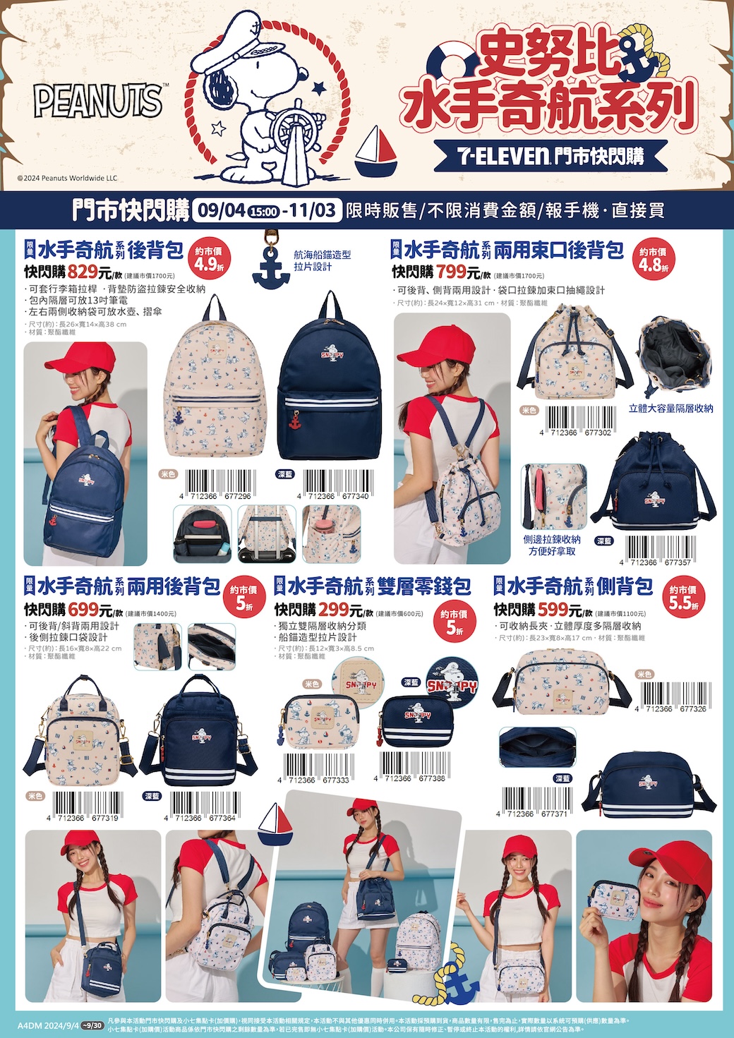 - 門市快閃購限定品項如下:自09/04(三)15:00開始至09/30(一):限量水手奇航系列後背包,共2款、限量水手奇航系列兩用束口後背包,共2款、限量水手奇航系列兩用後背包,共2款、限量水手奇航系列雙層零錢包,共2款、限量水手奇航系列側背包,共2款,前述商品皆含「限量門市快閃購+備品」。