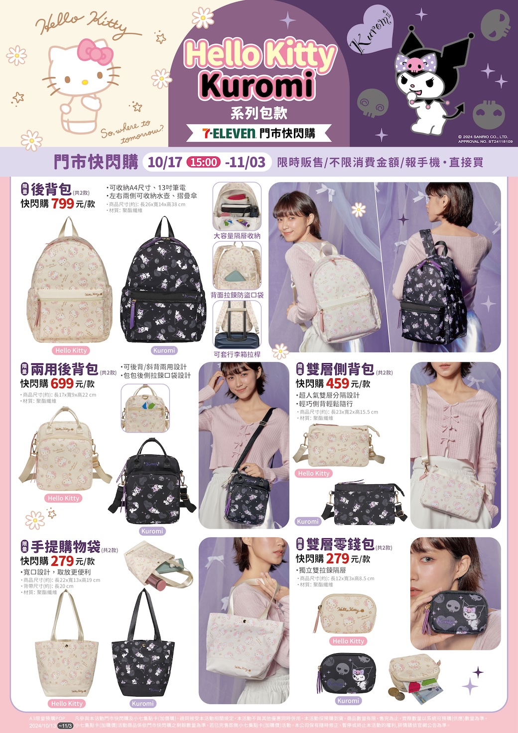 - 門市快閃購限定品項如下:自10/17(四)15:00開始至11/03(日):限量Hello Kitty&Kuromi後背包,共2款、限量Hello Kitty&Kuromi兩用後背包,共2款、限量Hello Kitty&Kuromi雙層側背包,共2款、限量Hello Kitty&Kuromi手提購物袋,共2款、限量Hello Kitty&Kuromi雙層零錢包,共2款,前述商品皆含「限量門市快閃購+備品」。