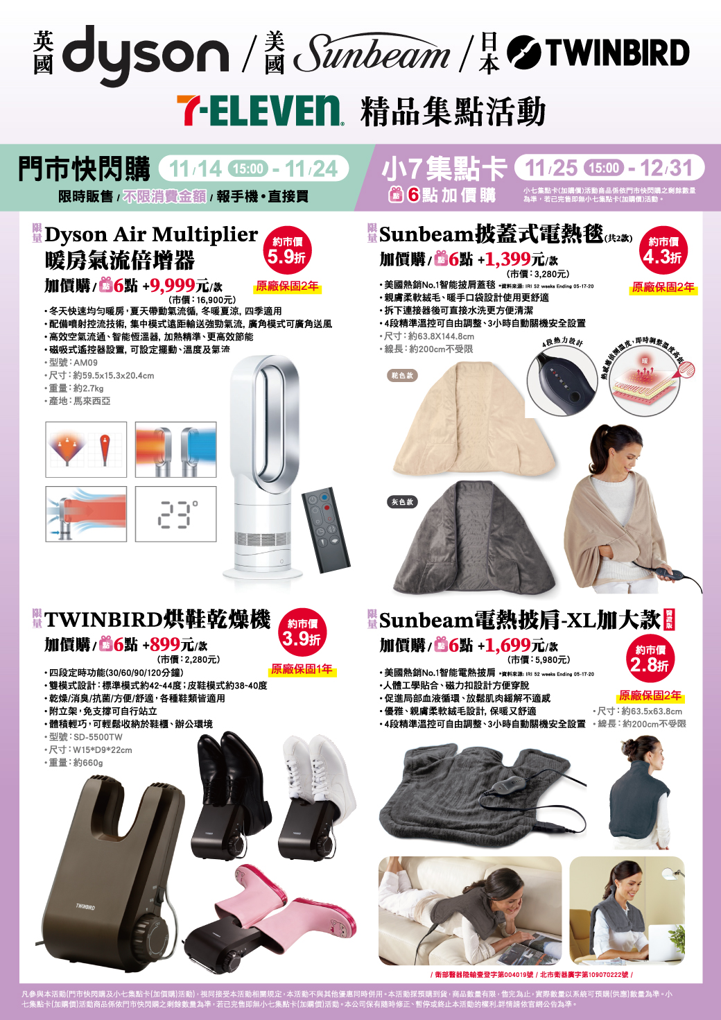 下列商品,自11/25(一)15:00開始:限量Dyson Air Multiplier暖房氣流倍增器,共1款、限量Sunbeam披蓋式電熱毯,共2款、限量Sunbeam電熱披肩-XL加大款,共1款、限量TWINBIRD烘鞋乾燥機,共1款,前述商品皆含「限量門市快閃購+限量集點送兌換+備品」。