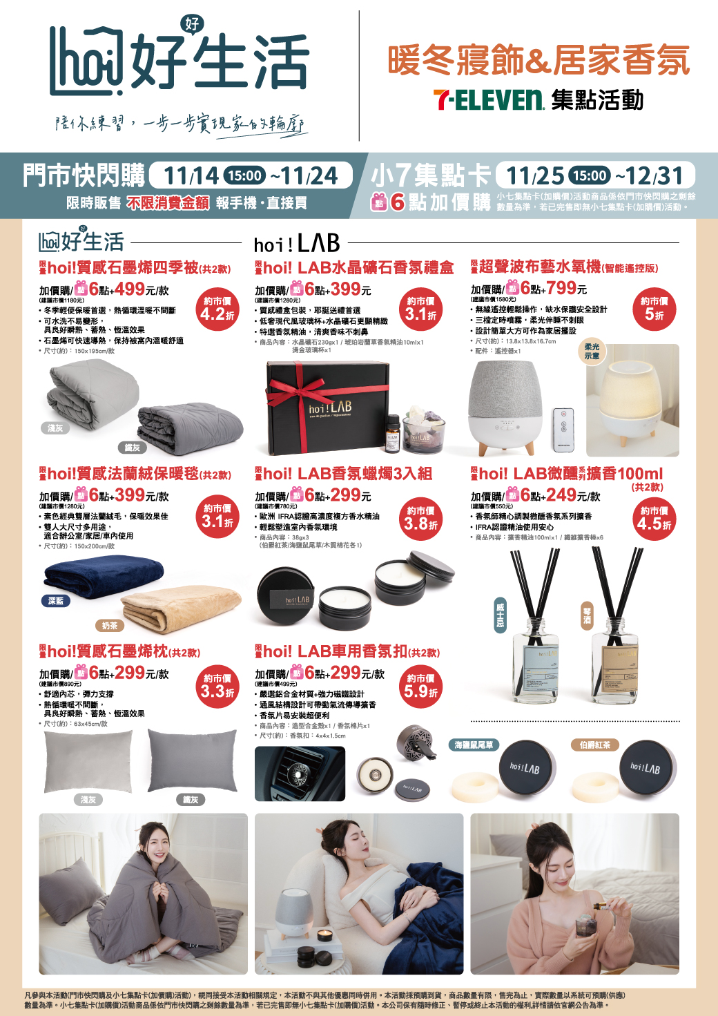 - 下列商品,自11/25(一)15:00開始:限量hoi!質感石墨烯四季被,共2款、限量hoi! LAB水晶礦石香氛禮盒,共1款、限量hoi!質感法蘭絨保暖毯,共2款、限量hoi! LAB香氛蠟燭3入組,共1款、限量hoi! LAB微醺系列擴香100ml,共2款、限量hoi!質感石墨烯枕,共2款、限量hoi! LAB車用香氛扣,共2款、限量超聲波布藝水氧機,共1款、限量快充磁吸行動電源,共4款,前述商品皆含「限量門市快閃購+限量集點送兌換+備品」。