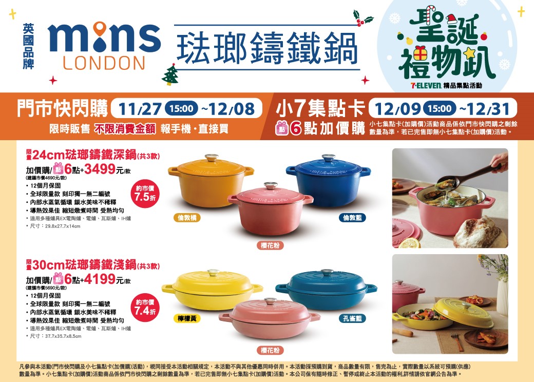 - 門市快閃購限定品項如下:自11/27(三)15:00開始至12/08(日):限量24cm琺瑯鑄鐵深鍋,共3款、限量30cm琺瑯鑄鐵淺鍋,共3款,前述商品皆含「限量門市快閃購+限量集點送兌換+備品」。