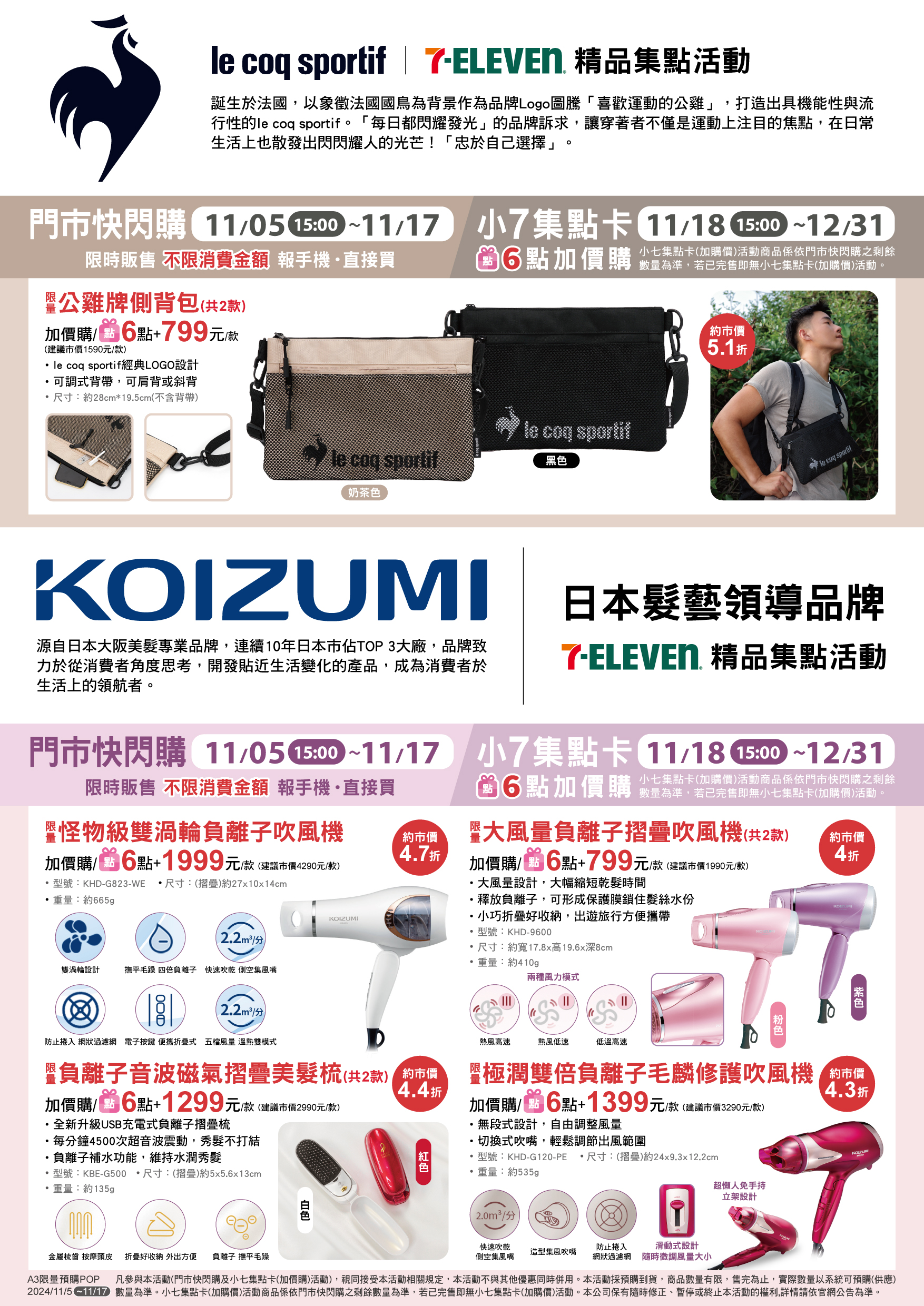 - 下列商品,自11/18(一)15:00開始:限量公雞牌側背包,共2款、限量KOIZUMI怪物級雙渦輪負離子吹風機,共1款、限量KOIZUMI負離子音波磁氣摺疊美髮梳,共2款、限量KOIZUMI大風量負離子摺疊吹風機,共2款、限量KOIZUMI極潤雙倍負離子毛鱗修護吹風機,共1款,前述商品皆含「限量門市快閃購+限量集點送兌換+備品」。