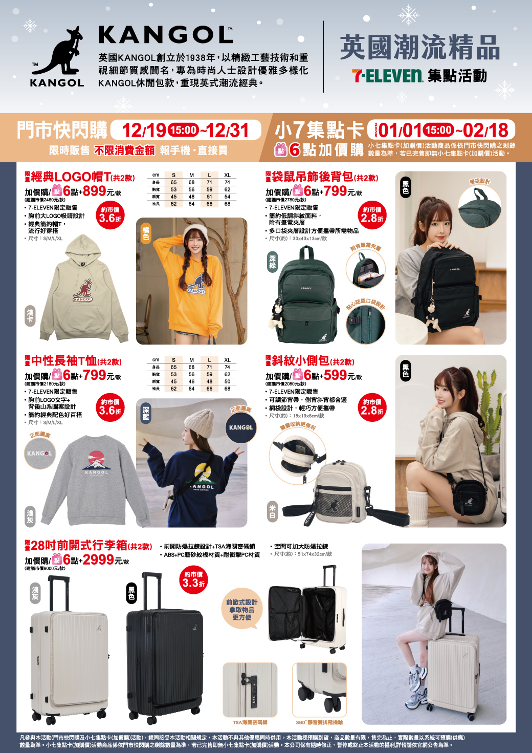 - 門市快閃購限定品項如下:自12/19(四)15:00開始:限量KANGOL經典LOGO帽T,共2款、限量KANGOL袋鼠吊飾後背包,共2款、限量KANGOL中性長袖T恤,共2款、限量KANGOL斜紋小側包,共2款、限量KANGOL28吋前開式行李箱,共2款、限量Polaroid寶麗來手機相片印相機+相紙超值組,共2款、限量THEORODA'S Hera簡約金屬腕錶,共1款、限量THEORODA'S Venus天然母貝紋石金屬腕錶,共1款、限量THEORODA'S真皮極薄RFID防盜女短夾,共3款、限量THEORODA'S真皮荔枝紋證件卡夾零錢包,共3款,前述商品皆含「限量門市快閃購+限量集點送兌換+備品」。