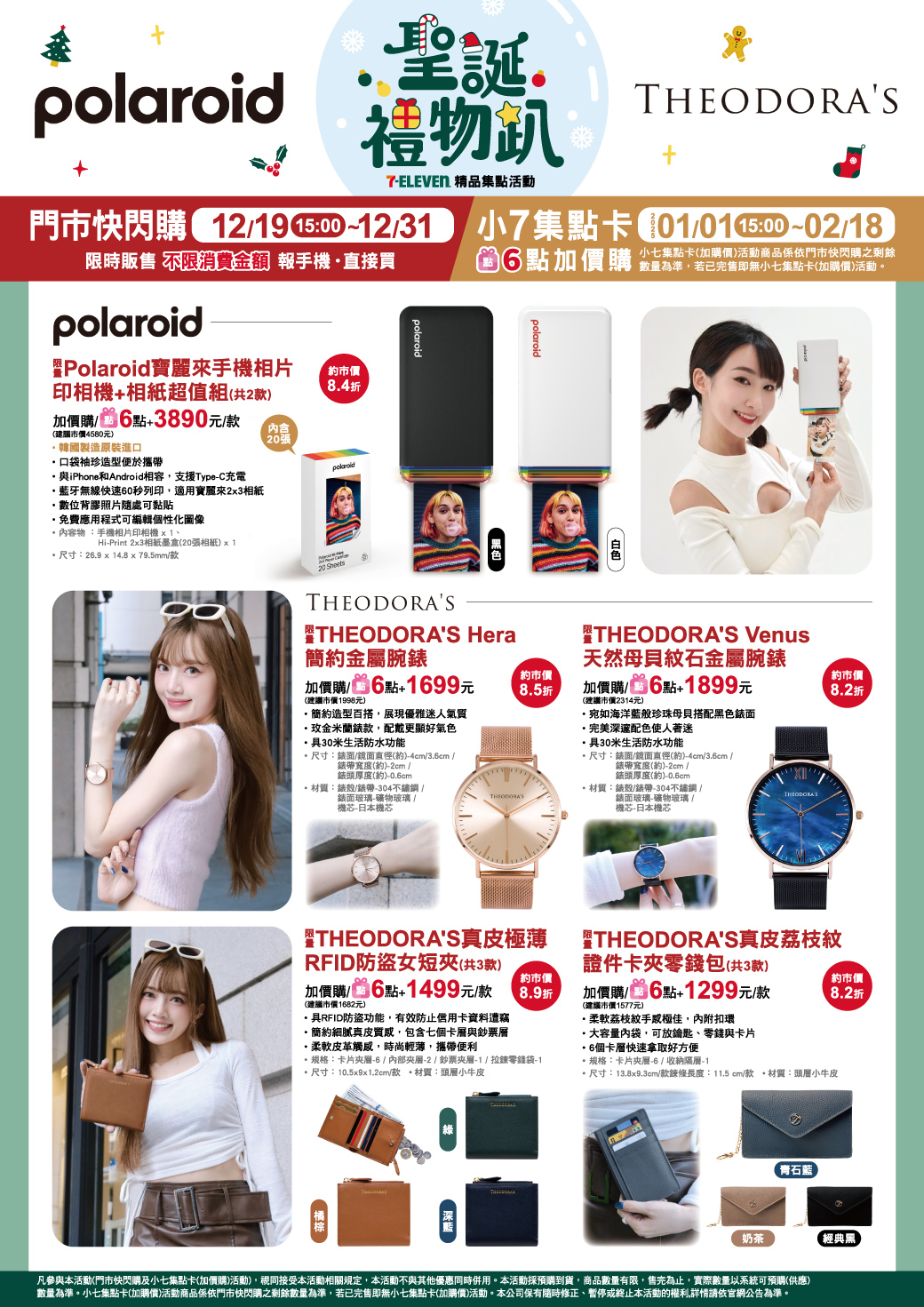 - 下列商品,自2025/01/01(三)15:00開始:限量KANGOL經典LOGO帽T,共2款、限量KANGOL袋鼠吊飾後背包,共2款、限量KANGOL中性長袖T恤,共2款、限量KANGOL斜紋小側包,共2款、限量KANGOL28吋前開式行李箱,共2款、限量Polaroid寶麗來手機相片印相機+相紙超值組,共2款、限量THEORODA'S Hera簡約金屬腕錶,共1款、限量THEORODA'S Venus天然母貝紋石金屬腕錶,共1款、限量THEORODA'S真皮極薄RFID防盜女短夾,共3款、限量THEORODA'S真皮荔枝紋證件卡夾零錢包,共3款,前述商品皆含「限量門市快閃購+限量集點送兌換+備品」。