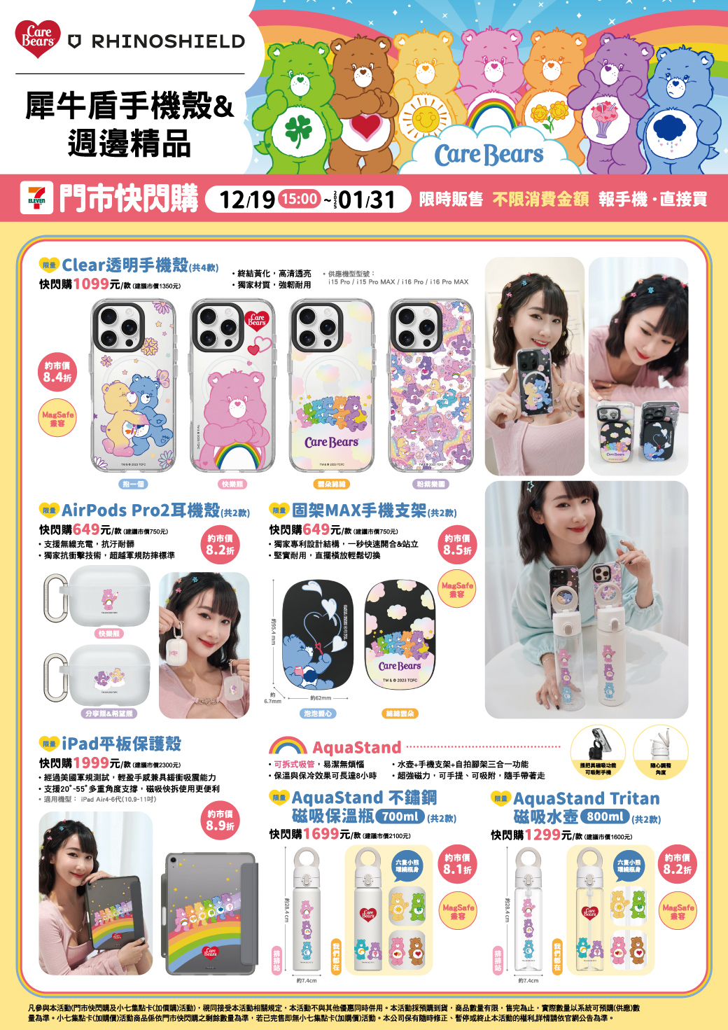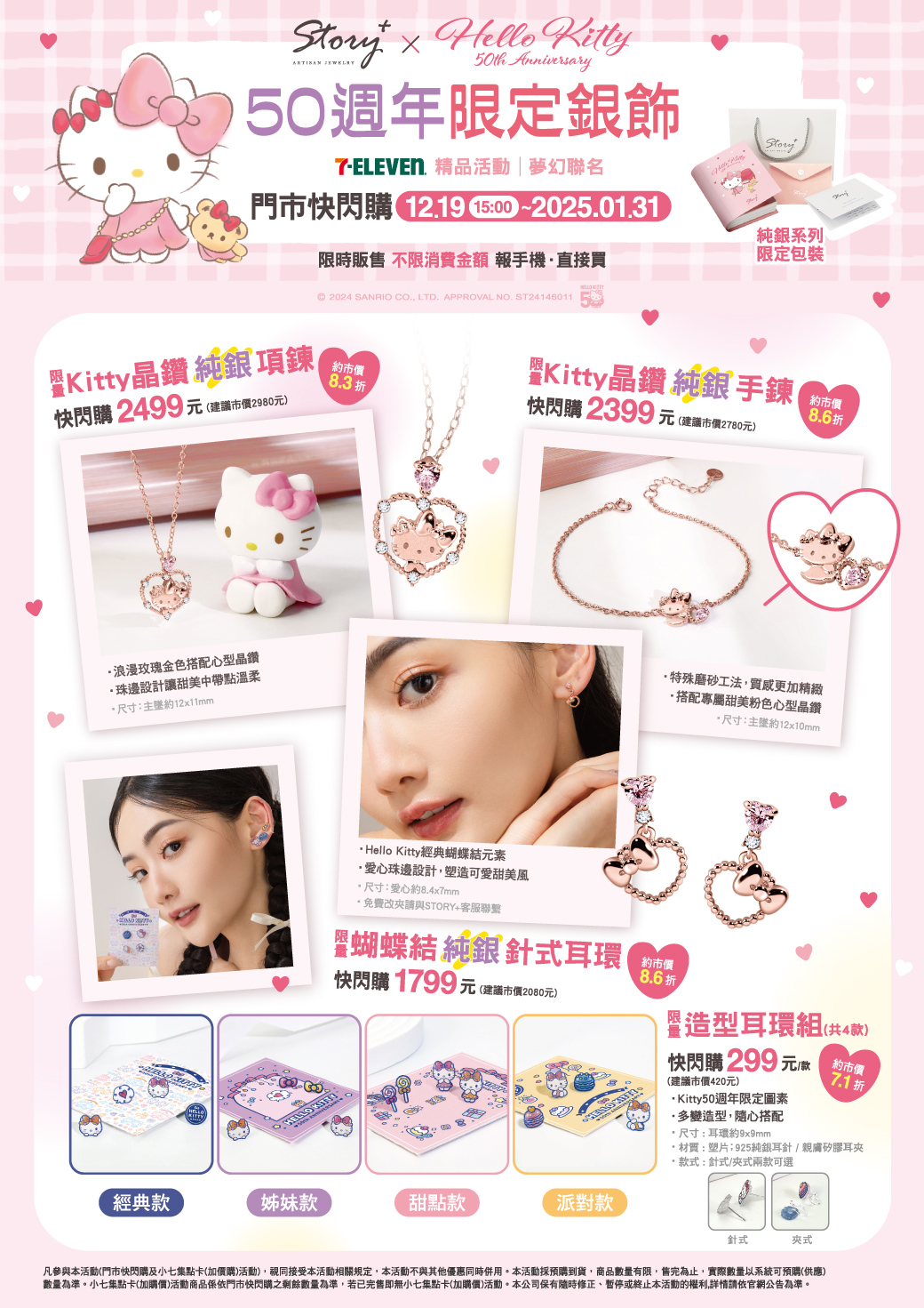 - 門市快閃購限定品項如下:自12/19(四)15:00開始至2025/01/31(五):限量Kitty晶鑽純銀項鍊,共1款、限量Kitty晶鑽純銀手鍊,共1款、限量蝴蝶結純銀針式耳環,共1款、限量造型耳環組,共4款、限量Clear透明手機殼,共4款、限量AirPods Pro2耳機殼,共2款、限量固架MAX手機支架,共2款、限量iPad平板保護殼,共1款、限量AquaStand不鏽鋼磁吸保溫瓶700ml,共2款、限量AquaStand Tritan磁吸水壺800ml,共2款,前述商品皆含「限量門市快閃購+備品」。