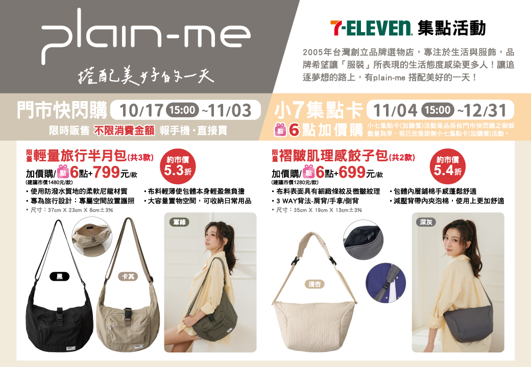 - 下列商品,自11/4(一)15:00開始:限量plain-me輕量旅行半月包,共3款、限量plain-me褶皺肌理感餃子包,共2款,前述商品皆含「限量門市快閃購+限量集點送兌換+備品」。