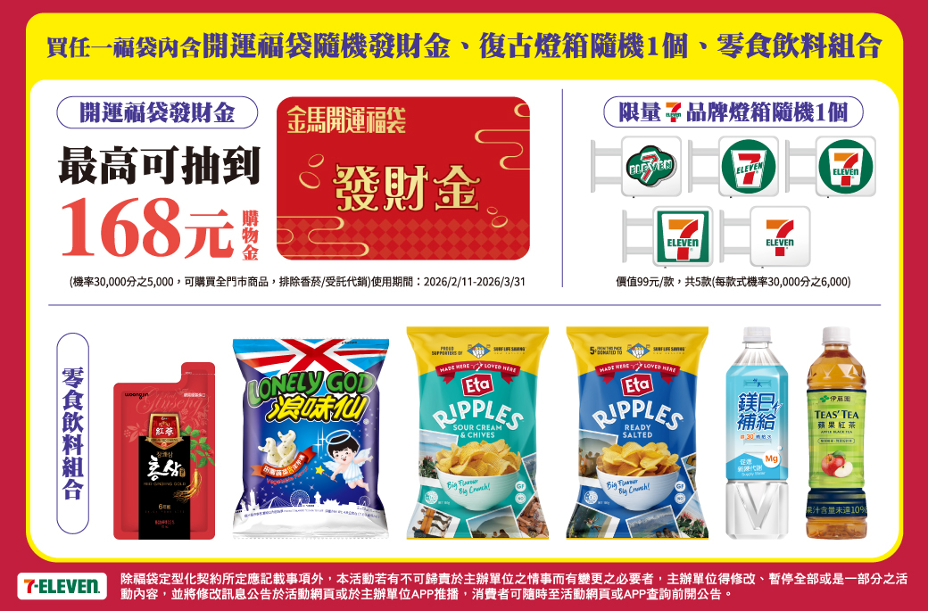 開運福袋發財金卡使用說明:有機會抽中5元(機率30,000分之25,000)、168元(機率30,000分之5,000),使用時間西元2026/2/11-2026/3/31止。發財金使用後無法退換貨。發財金限單筆交易一次使用於開立統一超商發票之門市,單筆交易上限使用5張,若與其他負項折抵工具同時使用(如:商品卡/點數折抵/商品禮券/i禮贈/行動隨時取兌領/折價券/提貨券/零錢包/中獎發票兌換/各種支付工具的紅利點數折抵金額...等),會先扣除其餘負項折抵工具後,再扣發財金, 發財金限折抵指定商品,指定商品不含:菸品/受託代銷商品/代收售/遊戲點卡(含InComm禮物卡)/ 通訊預購及精品預購(精品類商品,包括但不限3C家電、黃金、烈酒等商品)/行動隨時取/i預購/i划算/外送之服務),因商品與服務繁多,如未載明者,以門市收銀機刷讀結果為準。本卡屬無記名,若已拆封、使用、遺失、遭竊、詐取、滅失、遭第三人佔有,視同現金遺失,若毀損致條碼及卡號無法辨識等情形,恕無法提供加值金額賠償、退現、掛失支付或補發,敬請妥善保管使用。本活動不得與其他優惠併用。詳細活動辦法請見活動網頁公告,本公司保留最終解釋及決定權利。