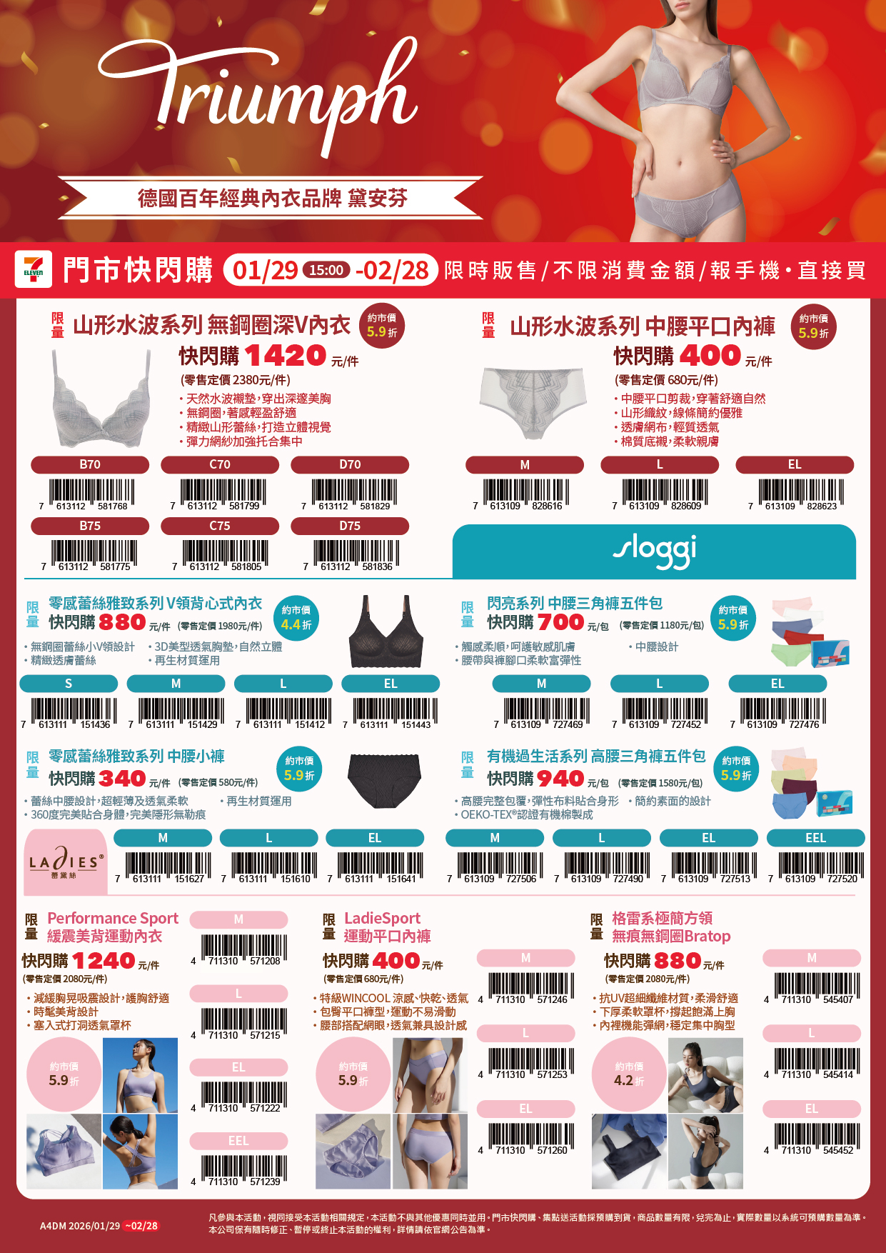 - 下列商品,自01/01(四)15:00開始:限量絨毛真皮厚底雪靴拖鞋,共2款、限量經典暖絨短筒厚底雪靴,共2款、限量雲朵暖絨短筒厚底雪靴,共2款、限量100%羊毛柔纖純色圍巾,共3款、限量柔感針織貓咪毛帽,共3款、限量光腿神器褲襪(連腳款/踩腳款),共4款,前述商品皆含「限量門市快閃購+限量集點送兌換+備品」。