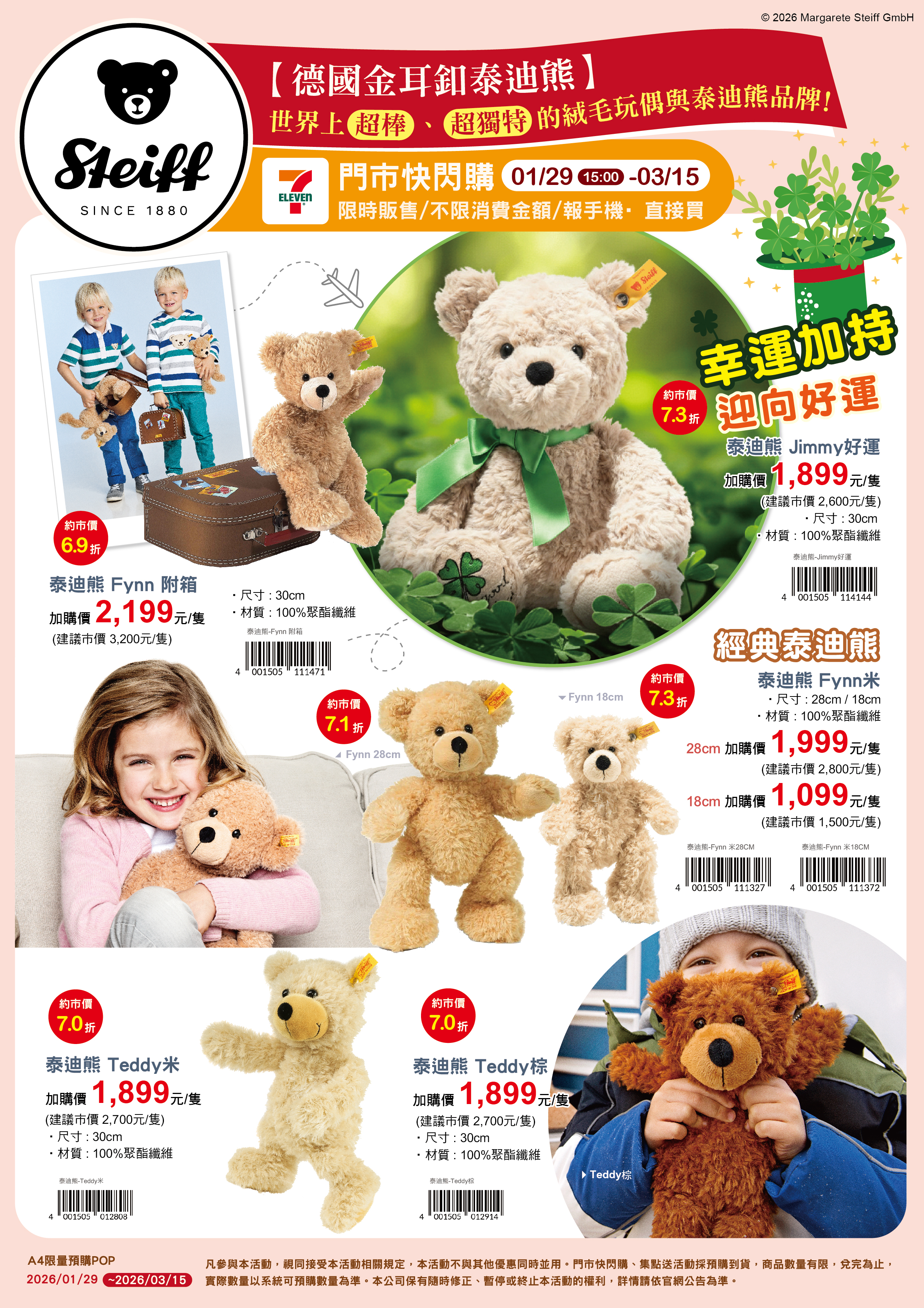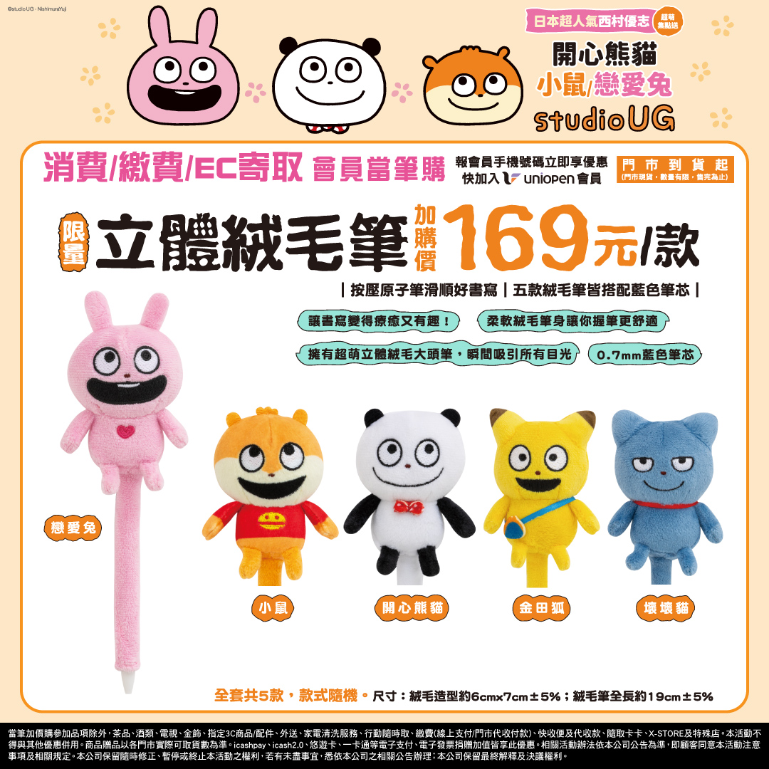 - 門市快閃購限定品項如下:自02/04(三)15:00開始:限量絨毛娃娃吊飾,共2款、限量繽紛坐姿玩偶,共2款、限量懶洋洋絨毛玩偶,共4款、限量溫熱暖暖玩偶抱枕,共1款、限量經典坐姿玩偶,共2款、限量經典玩偶束口袋,共2款、限量經典造型系列玩偶,共2款,前述商品皆含「限量門市快閃購+限量集點送兌換+備品」。