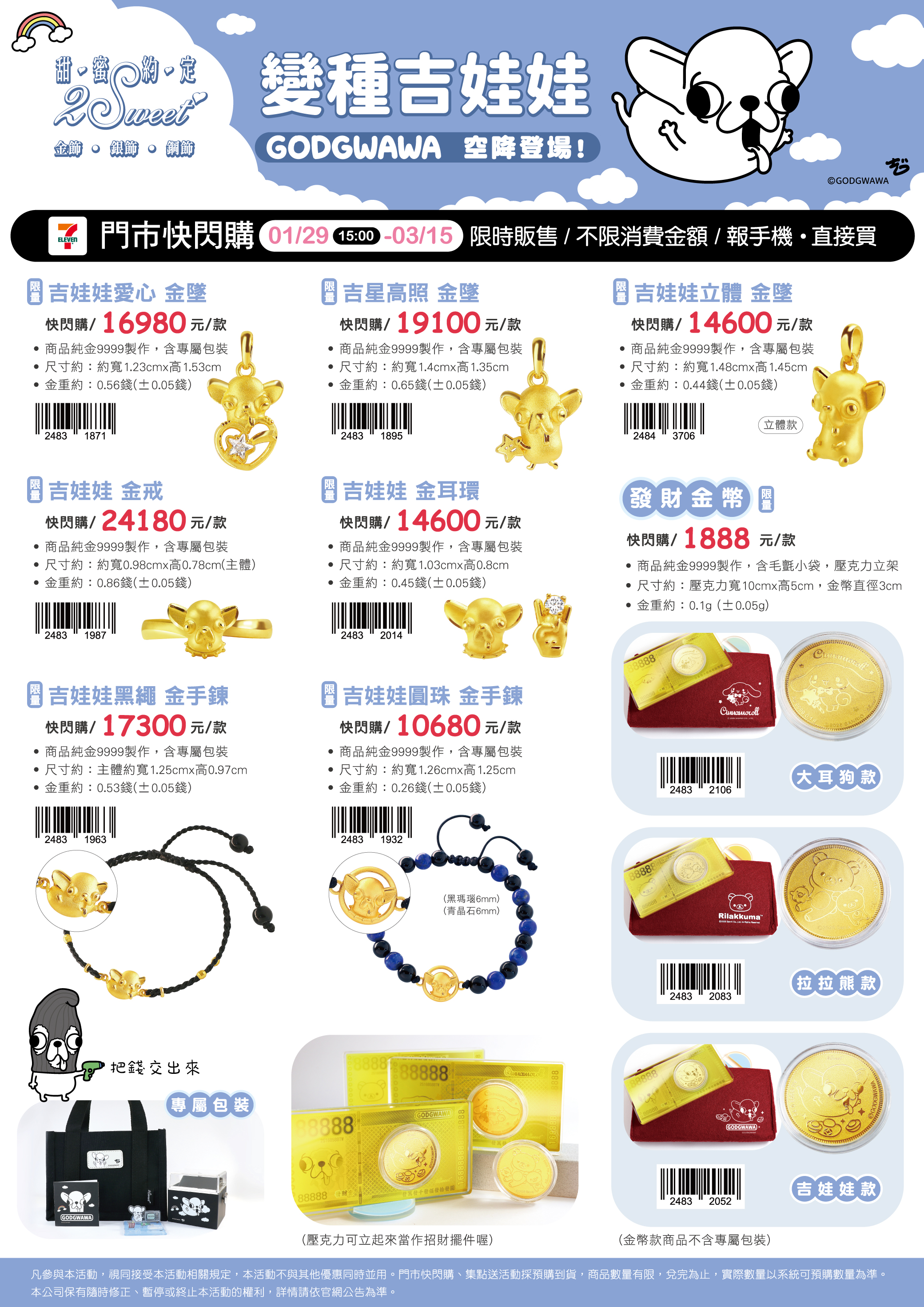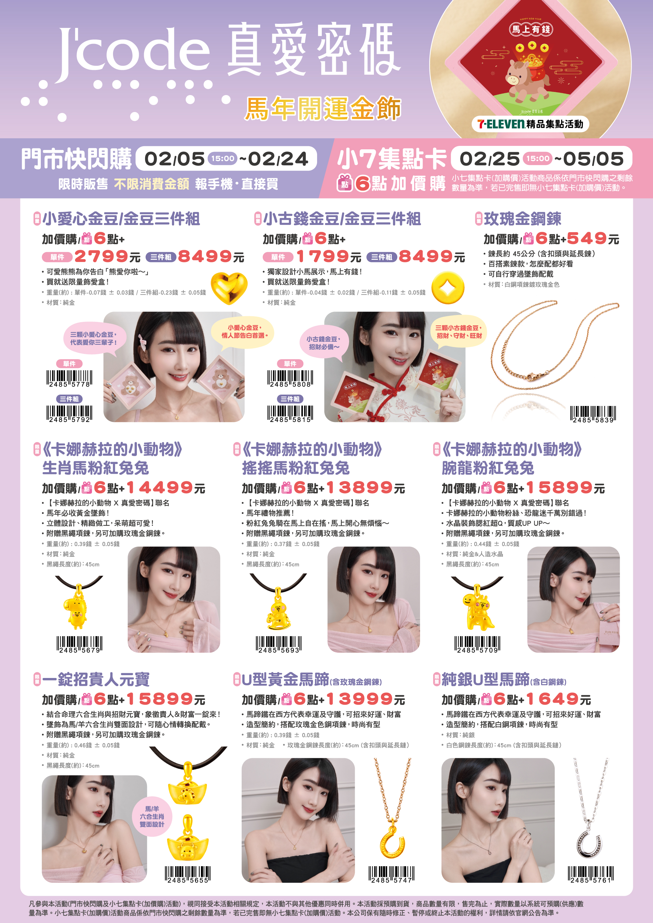 - 門市快閃購限定品項如下:自02/05(四)15:00開始:限量小愛心金豆單件,共1款、限量小愛心金豆三件組,共1款、限量小古錢金豆單件,共1款、限量小古錢金豆三件組,共1款、限量玫瑰金鋼鍊,共1款、限量卡娜赫拉的小動物生肖馬粉紅兔兔,共1款、限量卡娜赫拉的小動物搖搖馬粉紅兔兔,共1款、限量卡娜赫拉的小動物腕龍粉紅兔兔,共1款、限量一錠招貴人元寶,共1款、限量U型黃金馬蹄(含玫瑰金鋼鍊),共1款、限量純銀U型馬蹄(含白鋼鍊),共1款、限量黃金金條,共1款、限量馬上發財小金豆,共1款、限量開運粉金蠟繩手鍊,共2款、限量純金福氣如意金墜,共1款、限量花開富貴黃金墜,共1款、限量錢途無量發財小金物,共1款、限量黃金墜子-馬上富貴,共1款、限量黃金墜子-馬寶寶奶嘴,共1款、限量黃金墜子-好命小金馬,共1款、限量黃金墜子-馬上好運,共1款、限量黃金墜子-馬寶寶湯匙,共1款,前述商品皆含「限量門市快閃購+限量集點送兌換+備品」。