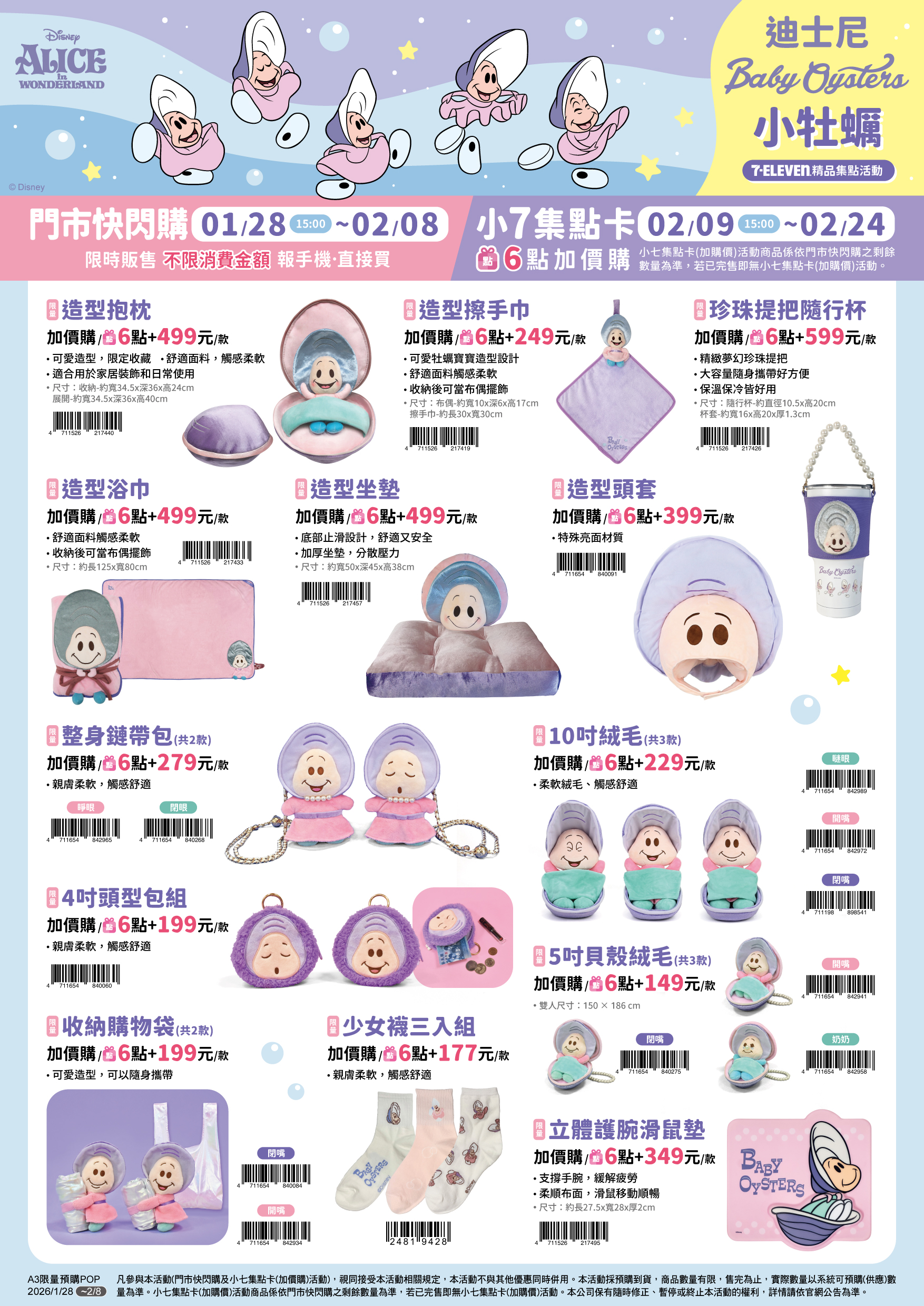 - 下列商品,自01/01(四)15:00開始:限量掌心儲金公仔,共1款、限量牡蠣寶寶日常系列盲盒單入,共基本6款+隱藏1款(隨機出貨)、限量牡蠣寶寶日常系列盲盒六入組,隨機出貨、限量抽皺後背包,共1款、限量側背包,共1款、限量手提袋,共1款、限量荷葉邊零錢包,共1款、限量造型零錢包,共1款、限量購物袋,共1款、限量雙層零錢包,共1款、限量證件票卡夾,共1款,前述商品皆含「限量門市快閃購+限量集點送兌換+備品」。