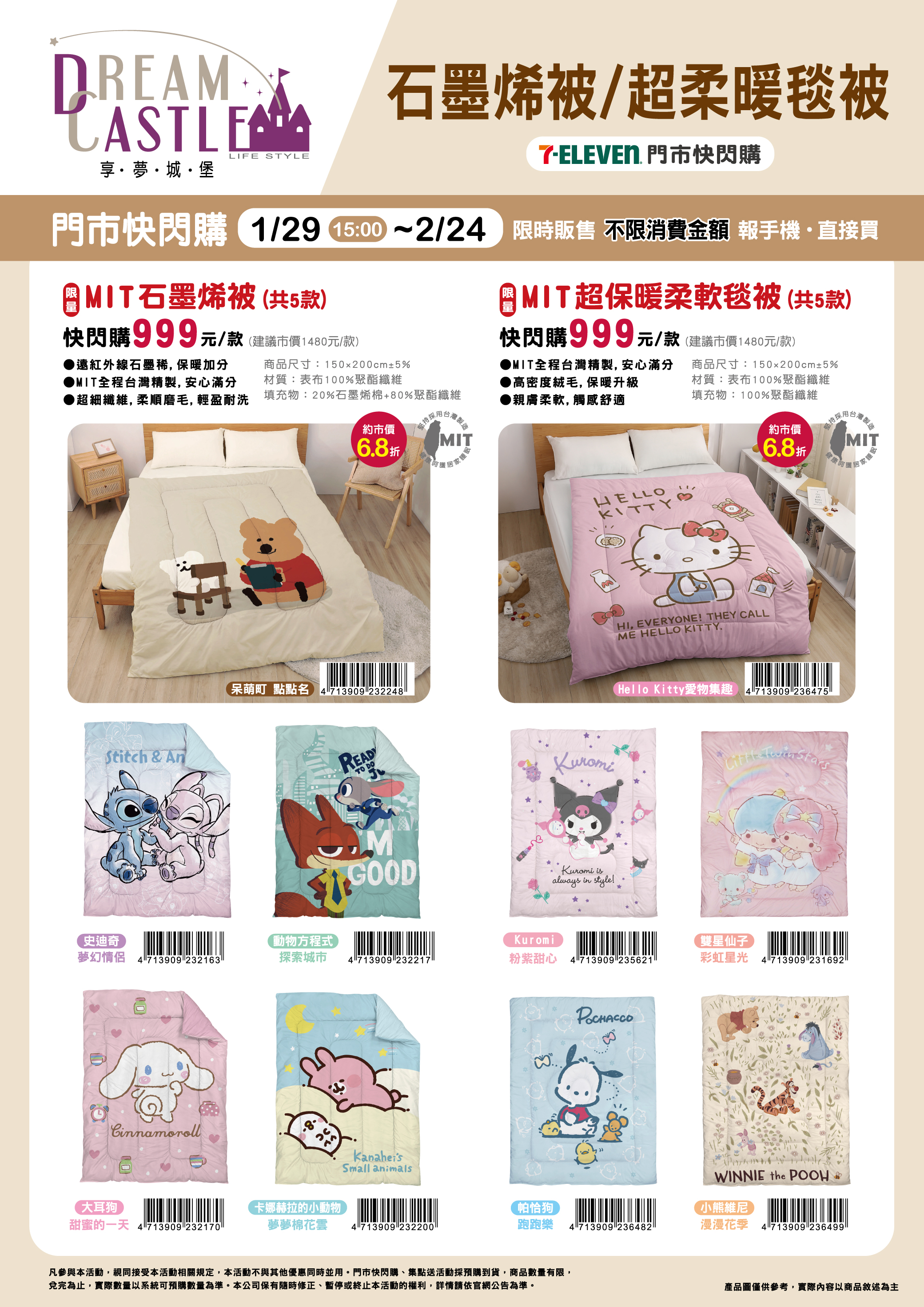 - 門市快閃購限定品項如下:自01/07(三)15:00開始至01/18(日):限量古典手繪出芽小枕,共3款、限量微春饗宴靠墊,共3款、限量湖區初雪日式童被,共2款、限量大不列顛保暖毯,共1款、限量碳原美學石墨烯遠紅外線冬被,共2款、限量日光光譜遠紅外線被,共3款、限量黑科技可水洗石墨烯被,共1款、限量二重紗透氣床包被套枕套組,共3款、限量軟呼呼四重紗多用途蓋毯,共4款,前述商品皆含「限量門市快閃購+限量集點送兌換+備品」。
