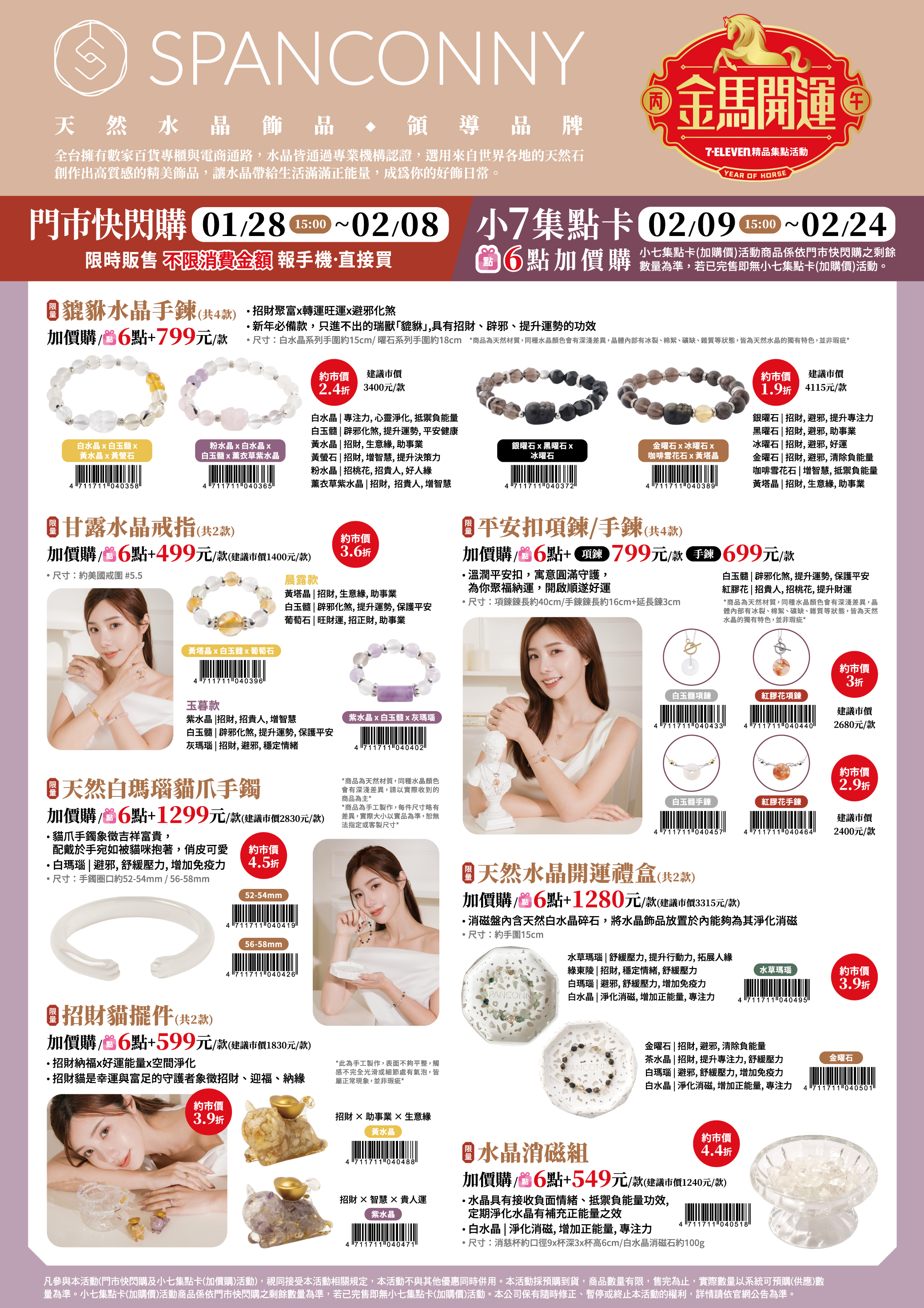 - 下列商品,自02/25(三)15:00開始:限量小愛心金豆單件,共1款、限量小愛心金豆三件組,共1款、限量小古錢金豆單件,共1款、限量小古錢金豆三件組,共1款、限量玫瑰金鋼鍊,共1款、限量卡娜赫拉的小動物生肖馬粉紅兔兔,共1款、限量卡娜赫拉的小動物搖搖馬粉紅兔兔,共1款、限量卡娜赫拉的小動物腕龍粉紅兔兔,共1款、限量一錠招貴人元寶,共1款、限量U型黃金馬蹄(含玫瑰金鋼鍊),共1款、限量純銀U型馬蹄(含白鋼鍊),共1款、限量黃金金條,共1款、限量馬上發財小金豆,共1款、限量開運粉金蠟繩手鍊,共2款、限量純金福氣如意金墜,共1款、限量花開富貴黃金墜,共1款、限量錢途無量發財小金物,共1款、限量黃金墜子-馬上富貴,共1款、限量黃金墜子-馬寶寶奶嘴,共1款、限量黃金墜子-好命小金馬,共1款、限量黃金墜子-馬上好運,共1款、限量黃金墜子-馬寶寶湯匙,共1款,前述商品皆含「限量門市快閃購+限量集點送兌換+備品」。