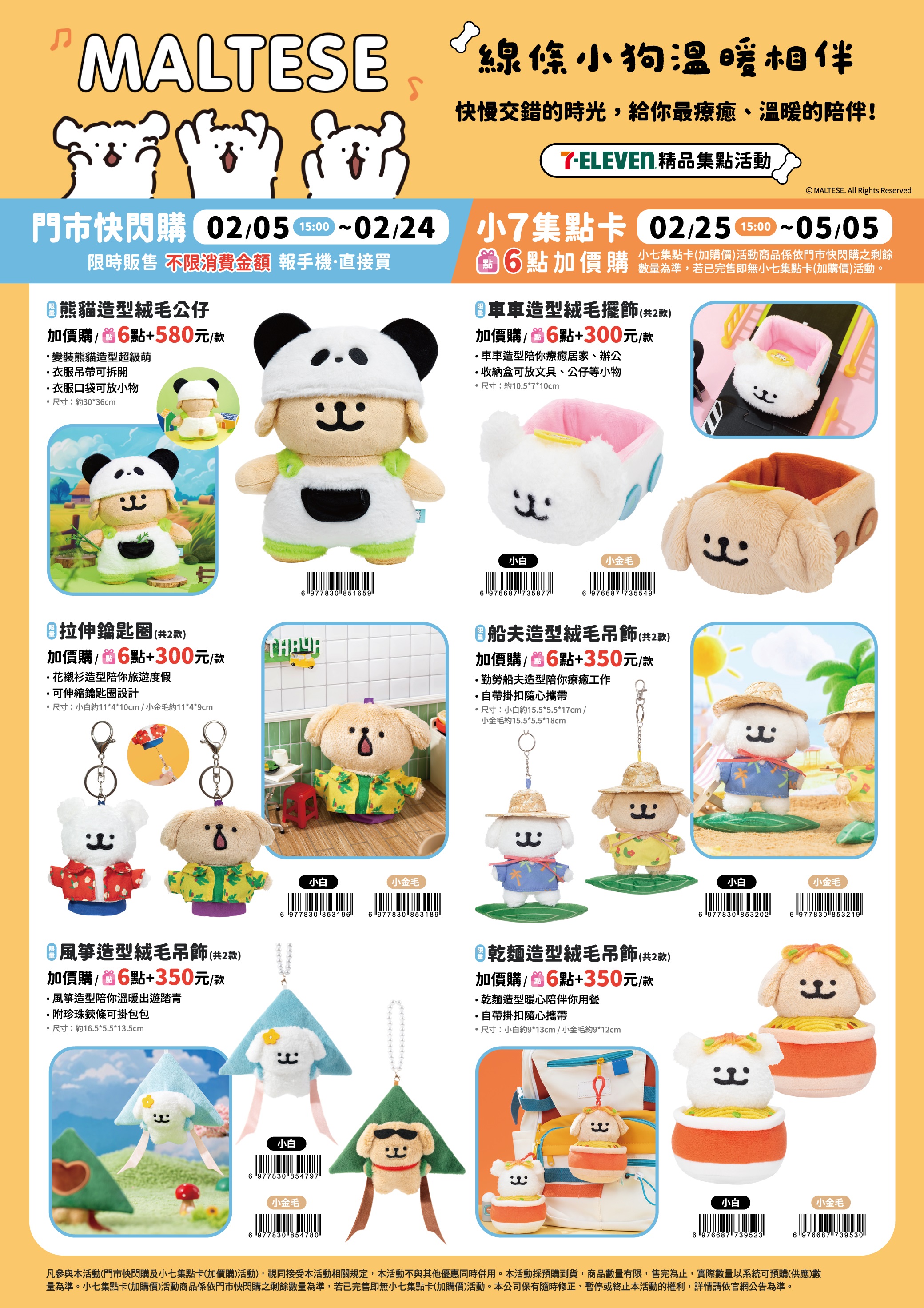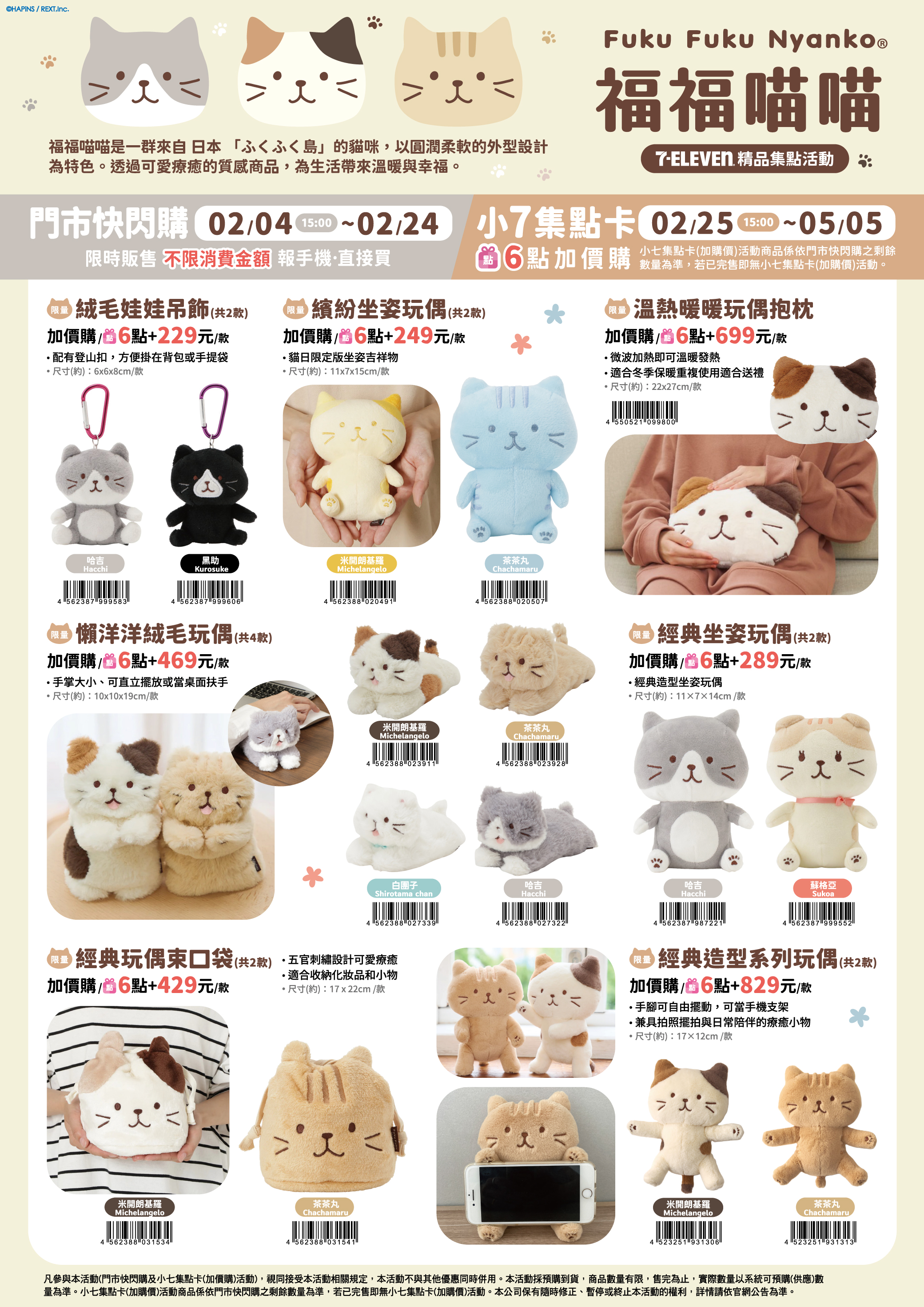 - 下列商品,自02/25(三)15:00開始:限量絨毛娃娃吊飾,共2款、限量繽紛坐姿玩偶,共2款、限量懶洋洋絨毛玩偶,共4款、限量溫熱暖暖玩偶抱枕,共1款、限量經典坐姿玩偶,共2款、限量經典玩偶束口袋,共2款、限量經典造型系列玩偶,共2款,前述商品皆含「限量門市快閃購+限量集點送兌換+備品」。