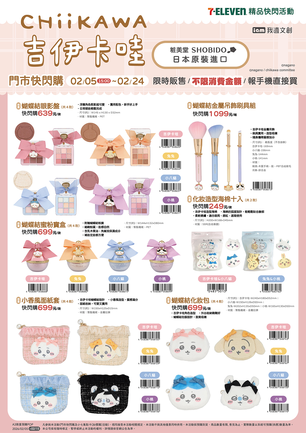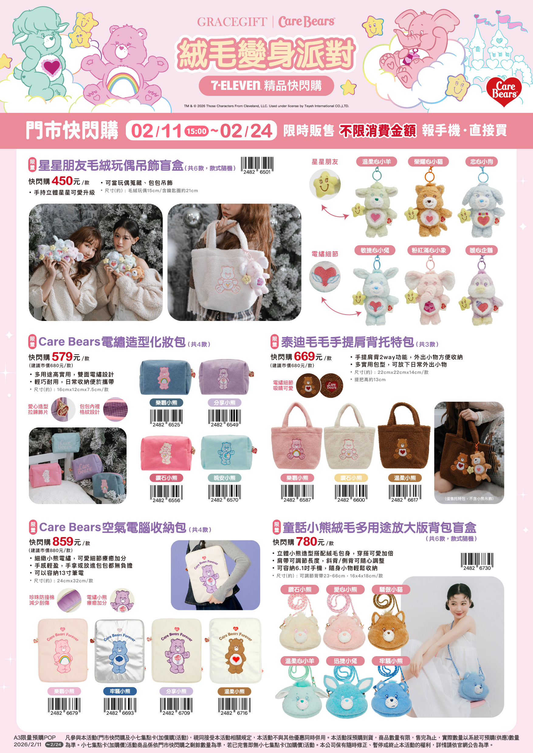 - 門市快閃購限定品項如下:自02/11(三)15:00開始:限量星星朋友毛絨玩偶吊飾盲盒,共6款(款式隨機)、限量Care Bears電繡造型化妝包,共4款、限量泰迪毛毛手提肩背托特包,共3款、限量Care Bears空氣電腦收納包,共4款、限量童話小熊絨毛多用途放大版背包盲盒,共6款(款式隨機),前述商品皆含「限量門市快閃購+備品」。