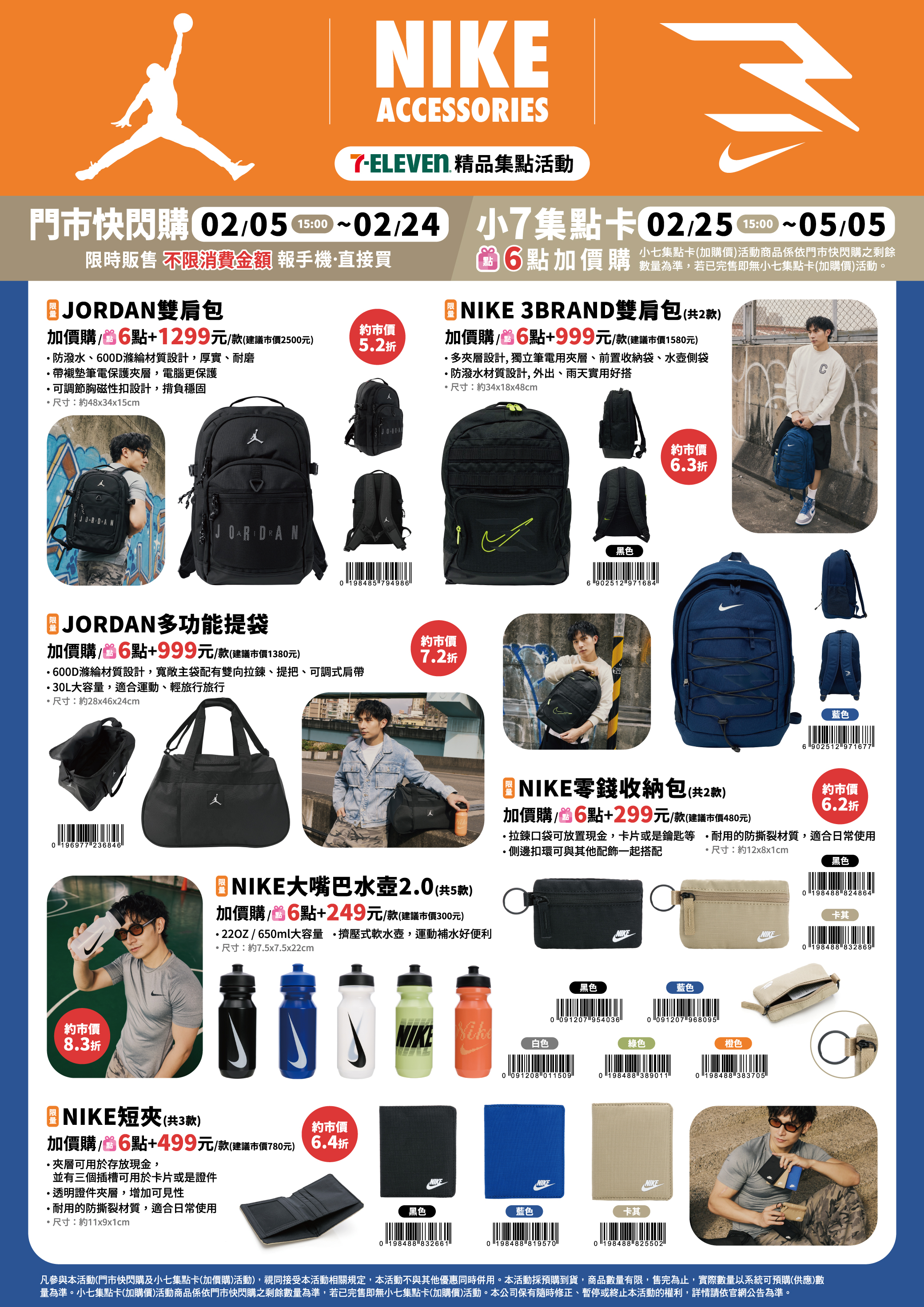 - 門市快閃購限定品項如下:自02/05(四)15:00開始:限量JORDAN雙肩包,共1款、限量JORDAN多功能提袋,共1款、限量NIKE大嘴巴水壺2.0,共5款、限量NIKE短夾,共3款、限量NIKE零錢收納包,共2款、限量NIKE 3BRAND雙肩包,共2款,前述商品皆含「限量門市快閃購+限量集點送兌換+備品」。