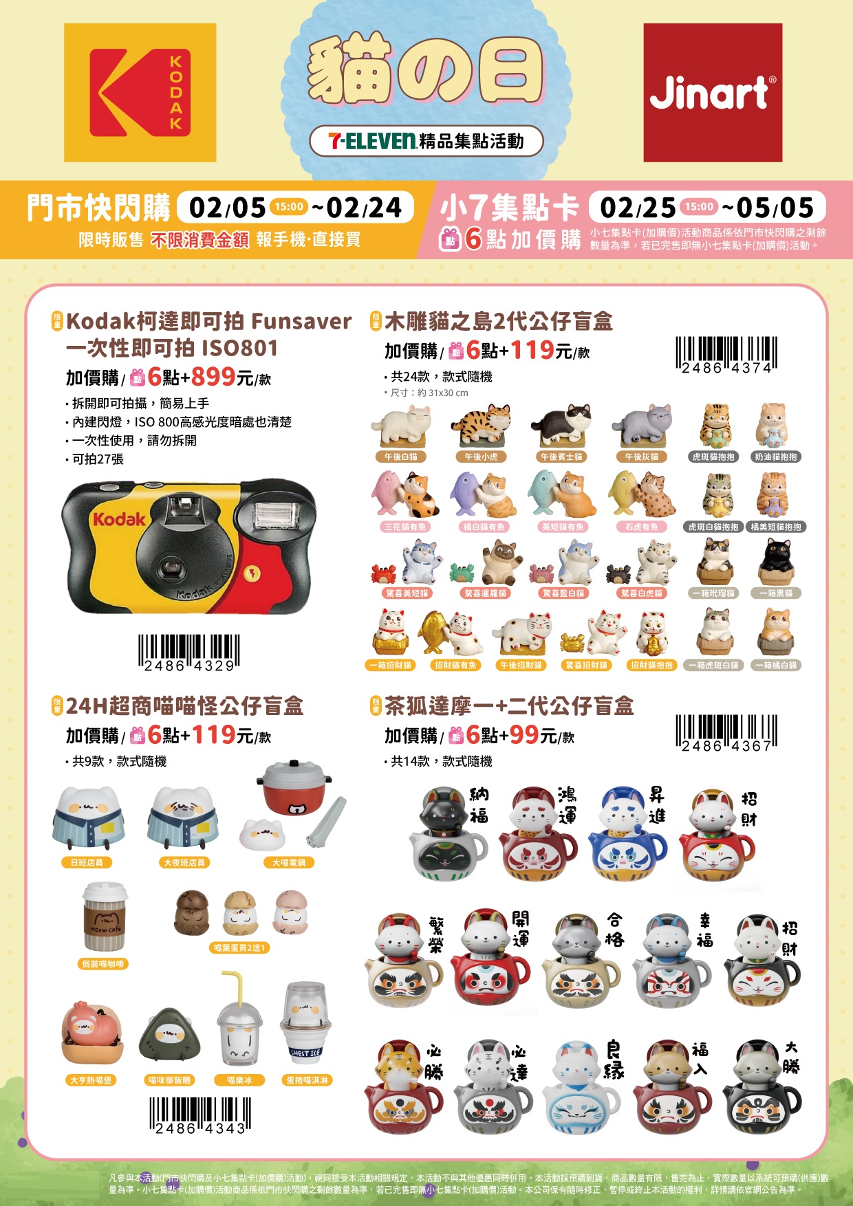 - 門市快閃購限定品項如下:自02/05(四)15:00開始:Kodak柯達即可拍Funsaver一次性即可拍ISO801,共1款、限量木雕貓之島2代公仔盲盒,共1款、限量24H超商喵喵怪公仔盲盒,共9款(款式隨機)、限量茶狐達摩一+二代公仔盲盒,共14款(款式隨機),前述商品皆含「限量門市快閃購+限量集點送兌換+備品」。